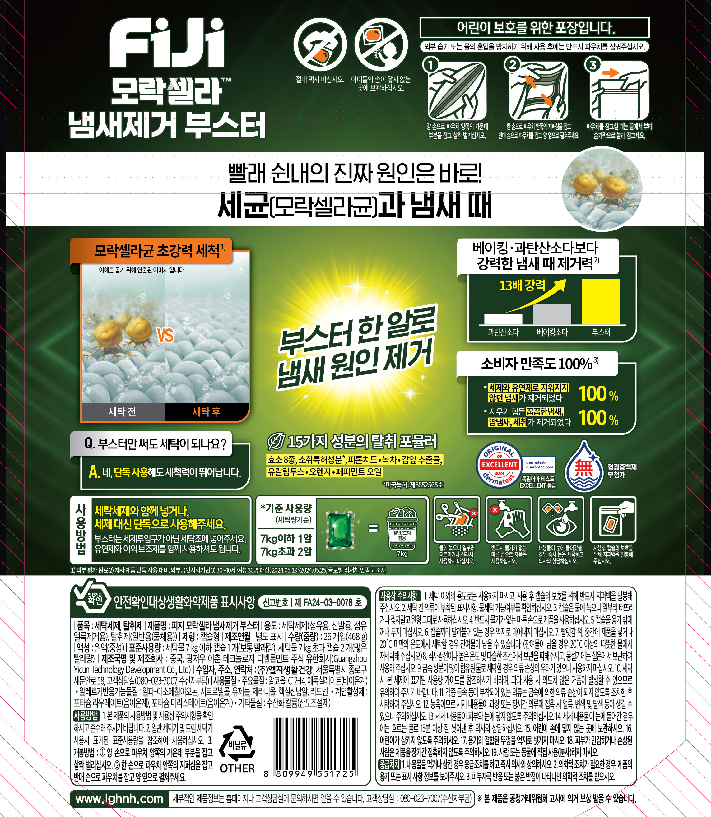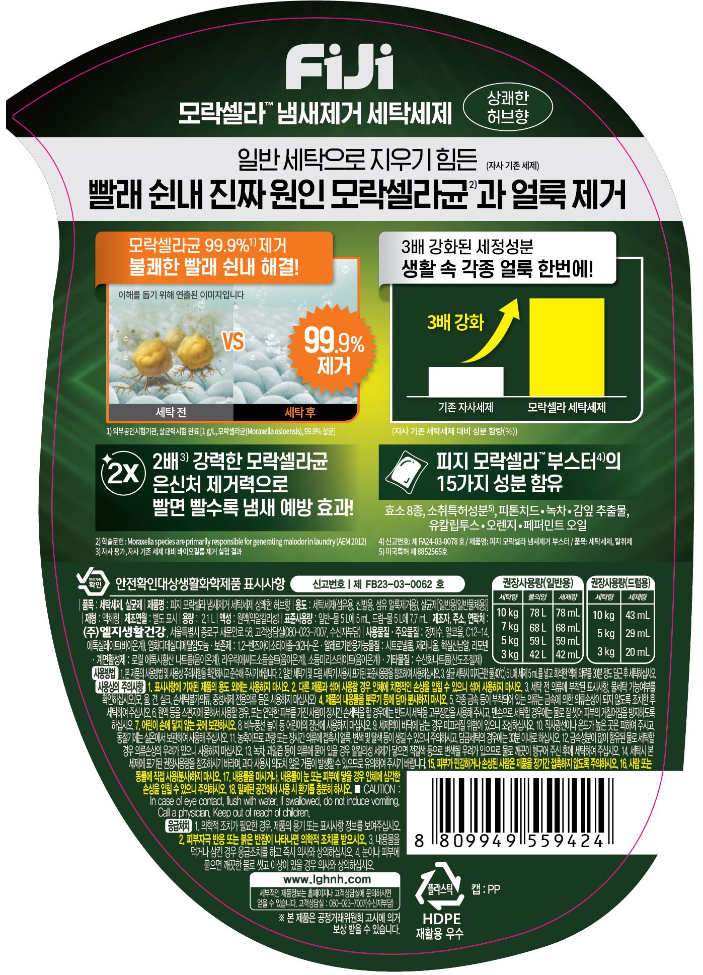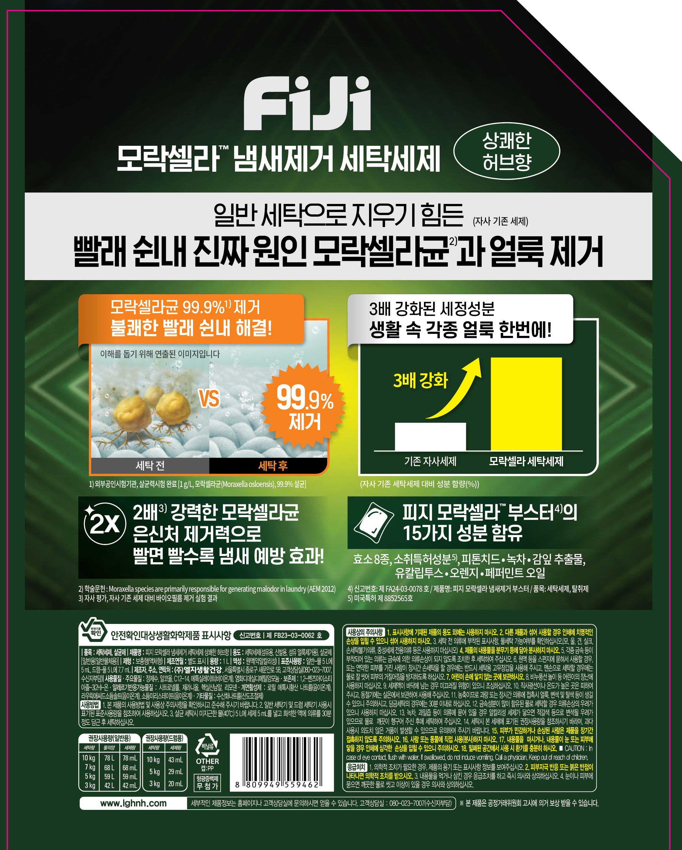 | 품목 및 제품명 | 살균제, 세탁세제 / 피지 모락셀라 냄새제거 세탁세제 상쾌한 허브향 | 탈취제, 세탁세제 / 피지 모락셀라 냄새제거 부스터 | 용도(표백제의 경우 계열을 함께표시) 및 제형 | 세탁세제(섬유용, 신발용, 섬유 얼룩제거용), 살균제[일반용(일반물체용)] / 액체형, 보충형(액체형) | 세탁세제(섬유용, 신발용, 섬유 얼룩제거용), 탈취제(일반용(물체용)) / 캡슐형 |