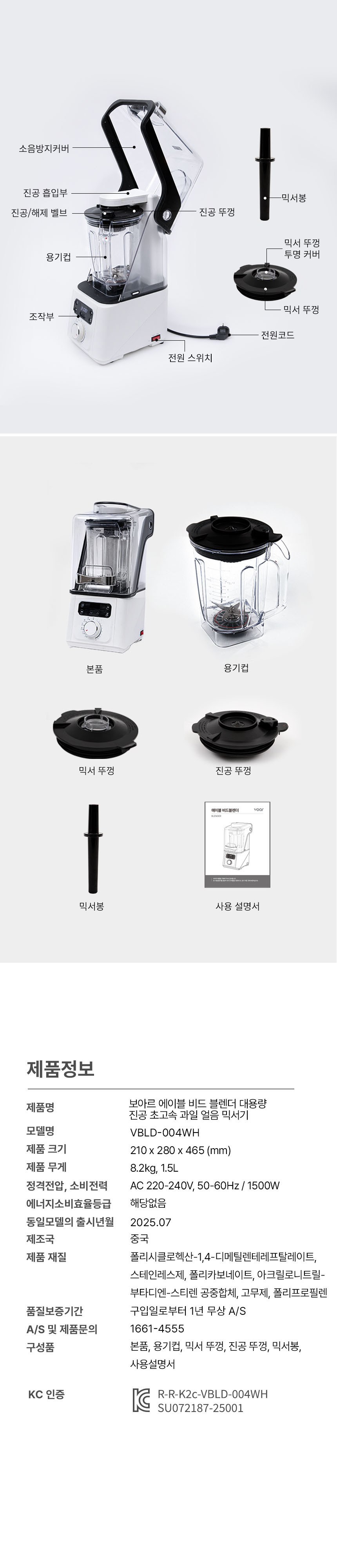 - 구성품: 본품 + 용기컵 + 믹서 뚜껑 + 진공 뚜껑 + 믹서봉 + 설명서