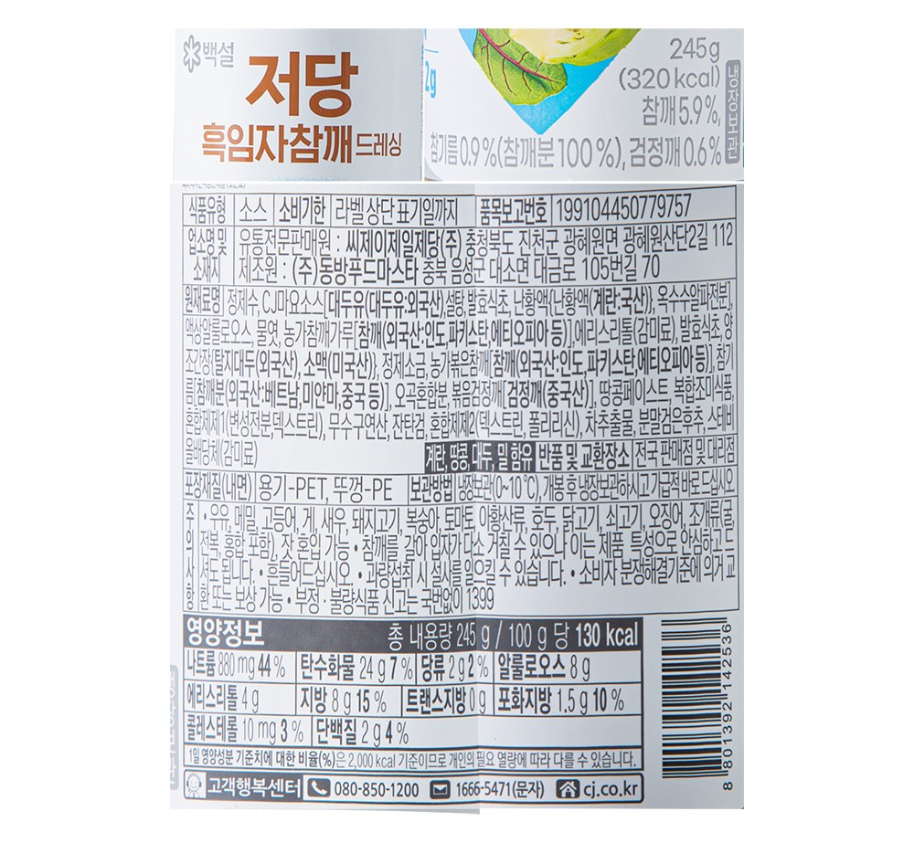 | 제품명 | 저당 흑임자참깨 드레싱 | 식품의 유형 | 컨텐츠 참조 |