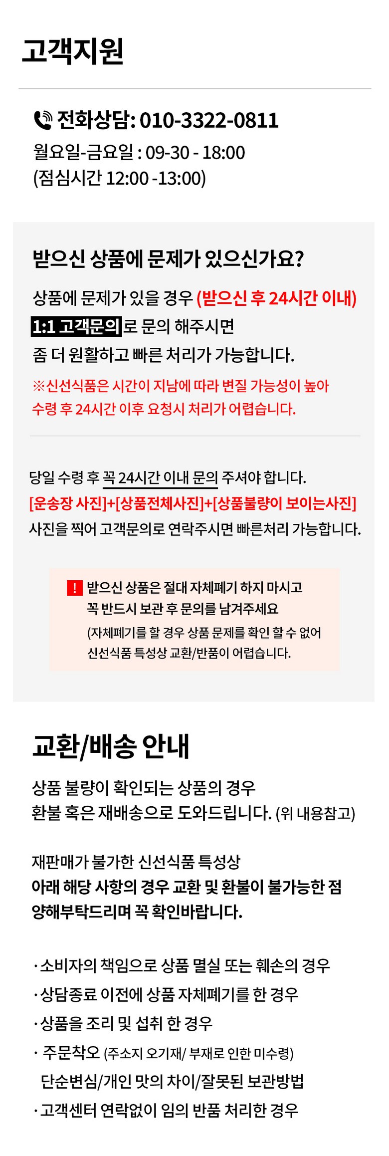 | 배송방법 | 신선/냉장/냉동 | 배송비 | 무료배송 - 도서산간 지역 배송불가 |