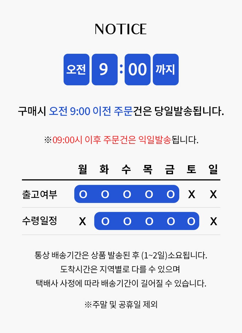 | 교환/반품 비용 (왕복비용) | 9,000원 - 단, 고객 변심의 경우에만 발생 - 도서산간 지역 배송불가 |