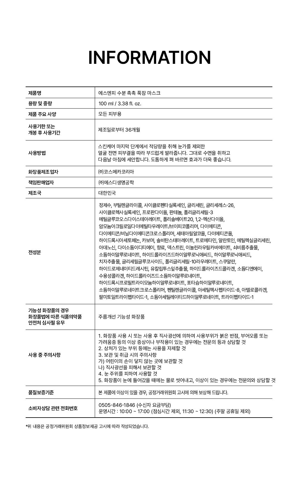 | 화장품제조업자, 화장품책임판매업자 및 맞춤형화장품판매업자 | 컨텐츠 참조 | 제조국 | 컨텐츠 참조 |