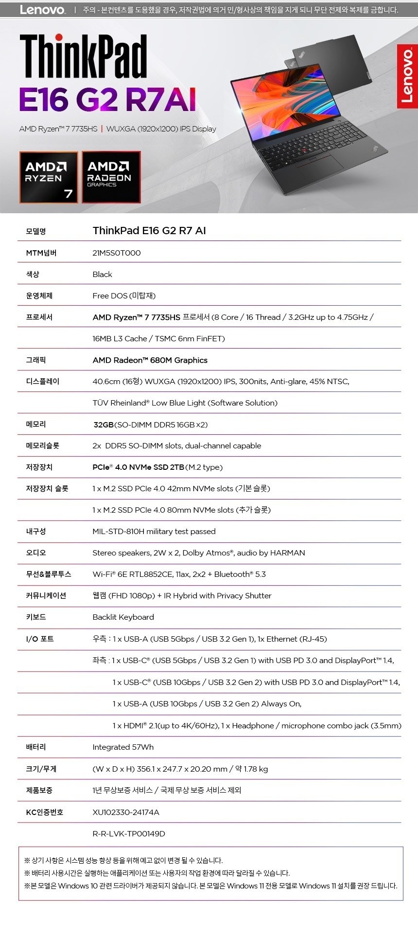| 품명 및 모델명 | 노트북 / ThinkPad E16 gen 2 | KC 인증정보 | R-R-LVK-TP00149D, XU102330-24174A |