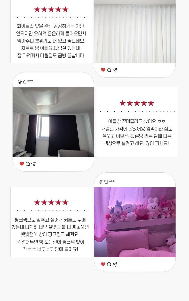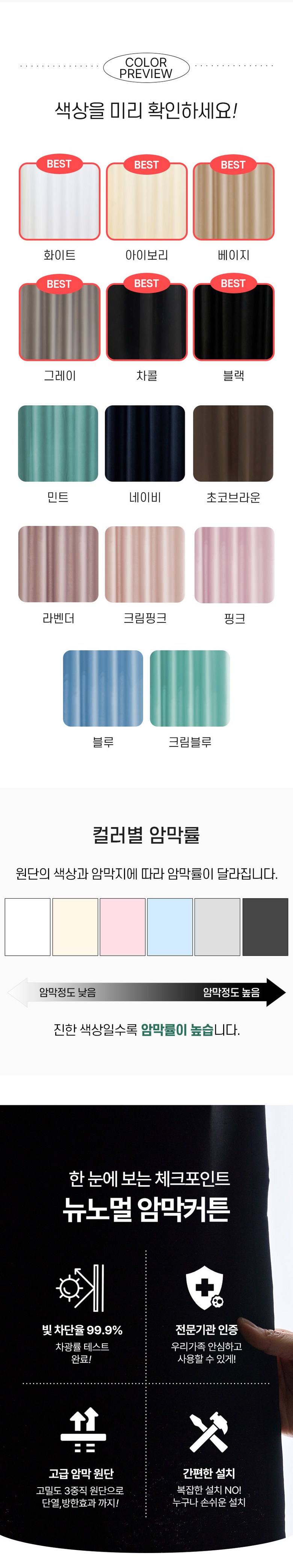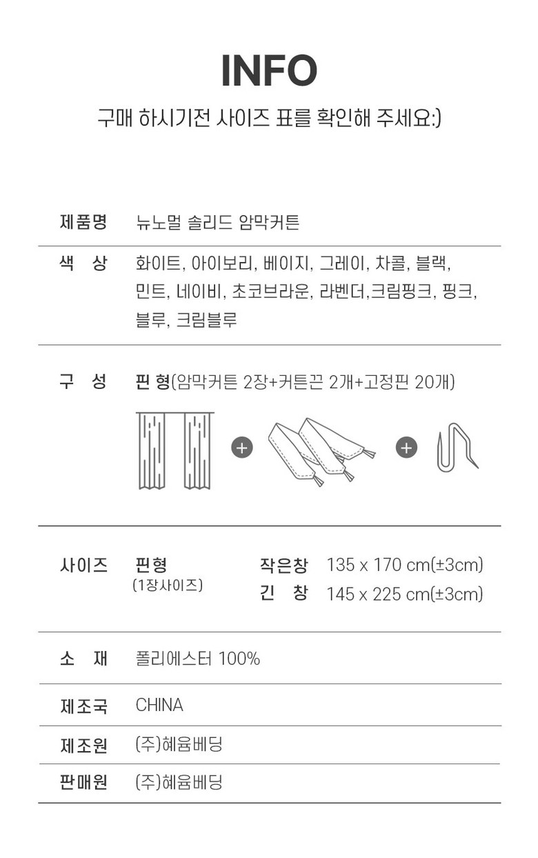 | 치수 | 상세페이지 참조 | 제품구성 | 암막커튼 2장+커튼끈 2개+커튼핀 20개 |