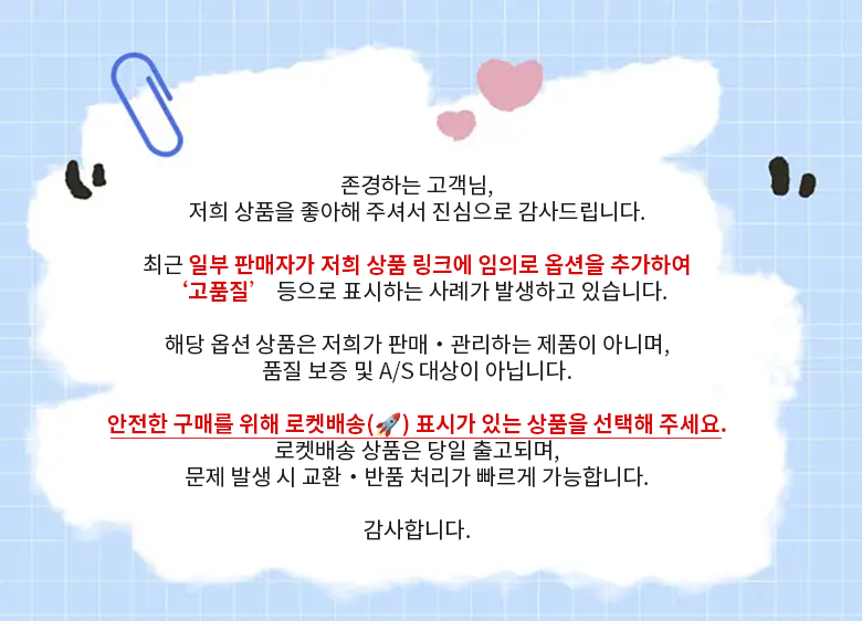 - ㆍ모니터 해상도의 차이로 인해 색상이나 이미지가 실제와 달라, 고객이 단순 변심으로 교환/반품을 무료로 요청하는 경우