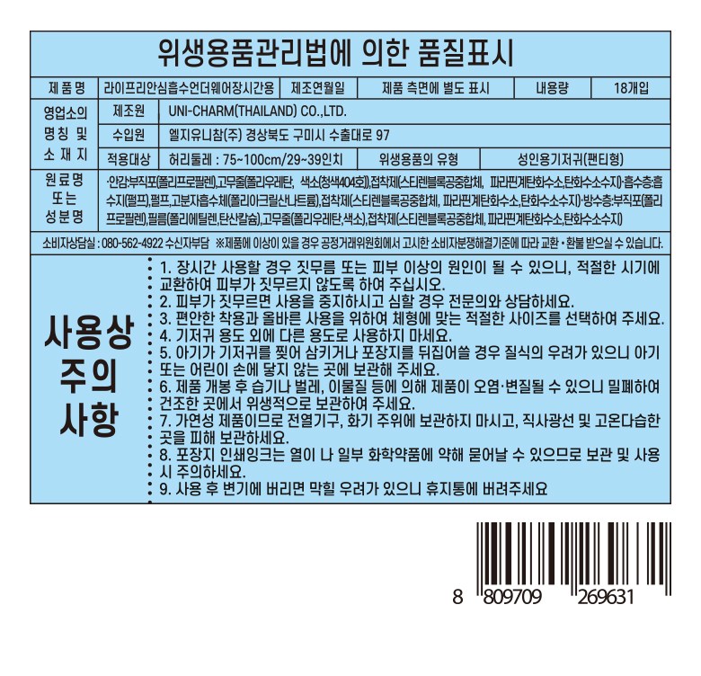 | 제조국(원산지) | 태국 | 제조자(수입자) | UNI-CHARM(THAILAND) CO.,LTD. / 엘지유니참(주) |