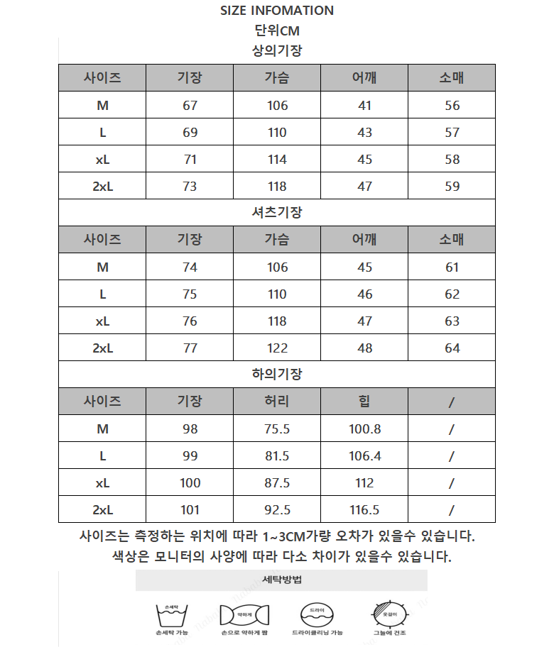 | 제조국 | 중국 | 세탁방법 및 취급시 주의사항 | 상품 상세페이지 참조 |