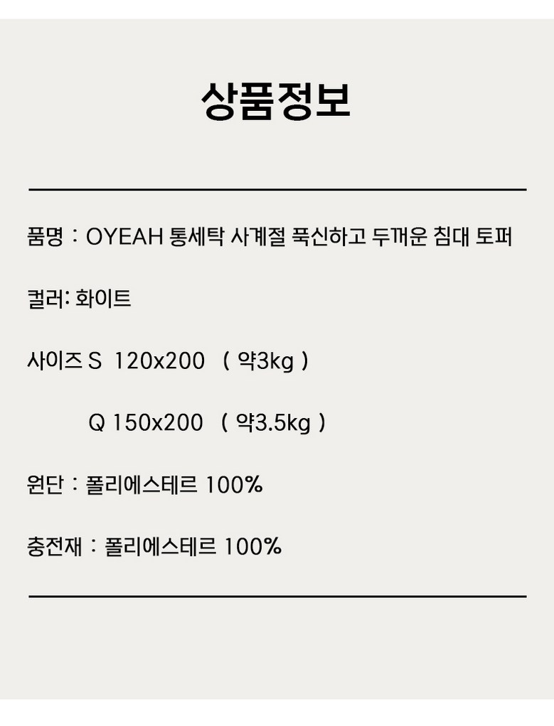 | 치수 | S(120x200),Q(150x200) | 제품구성 | 폴리에스테르섬유 |