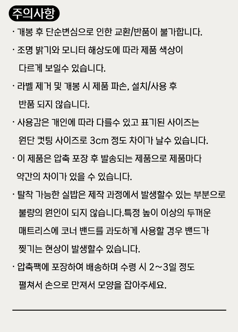 - ㆍ모니터 해상도의 차이로 인해 색상이나 이미지가 실제와 달라, 고객이 단순 변심으로 교환/반품을 무료로 요청하는 경우