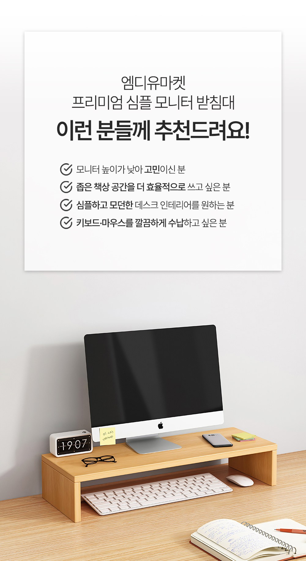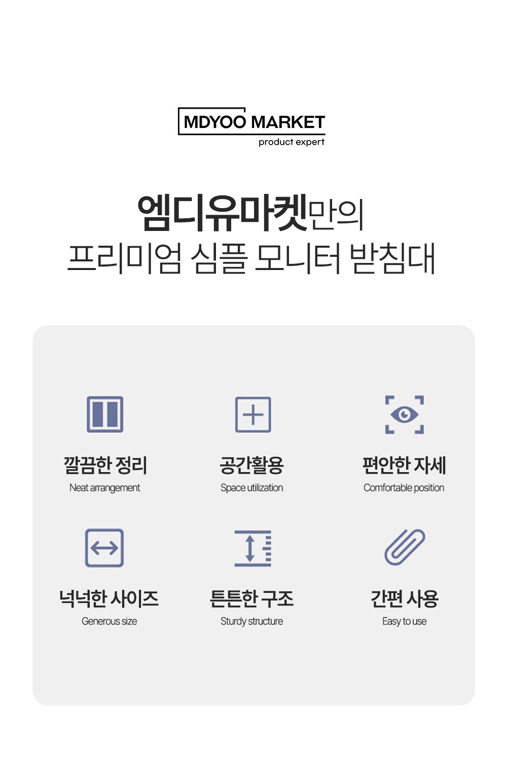 | 품명 | 엠디유마켓 프리미엄 심플 모니터 받침대 | KC 인증정보 | 해당없음 |