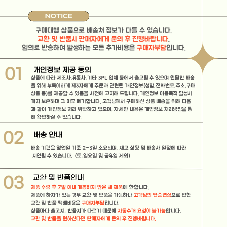 - ㆍ교환/반품에 관한 일반적인 사항은 판매자가 제시사항보다 관계법령이 우선합니다.