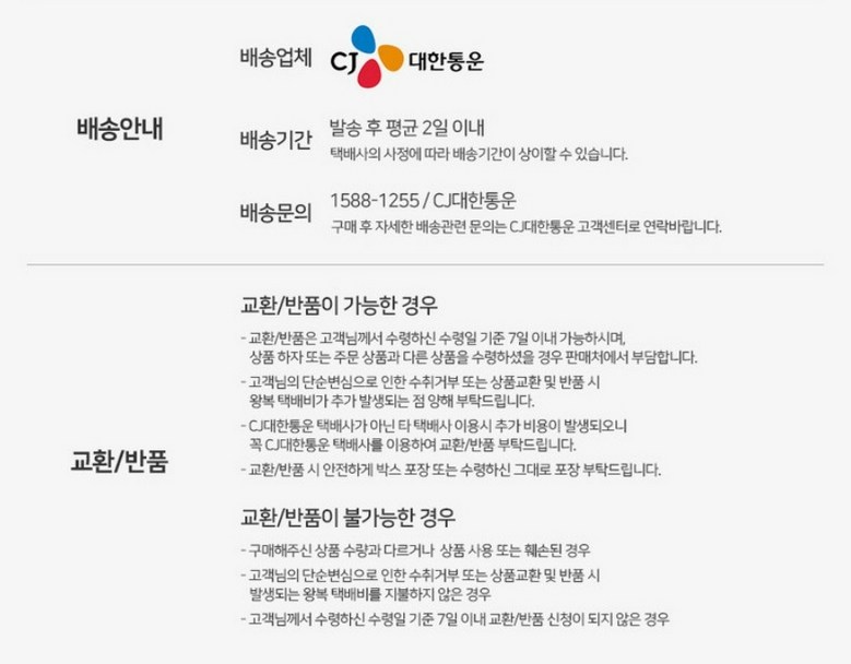 | 교환/반품 신청 기준일 | ㆍ단순변심에 의한 교환/반품은 제품 수령 후 7일 이내까지, 교환/반품 제한사항에 해당하지 않는 경우에만 가능 (배송비용과 교환/반품 비용 왕복배송비 고객부담) ㆍ상품의 내용이 표시·광고의 내용과 다른 경우에는 상품을 수령한 날부터 3개월 이내, 그 사실을 안 날 또는 알 수 있었던 날부터 |