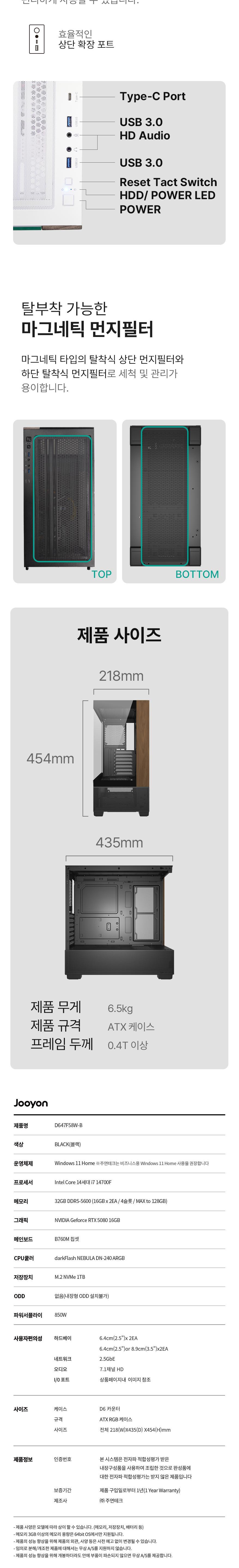 | 품명 및 모델명 | 조립PC / D647F58W-B | KC 인증정보 | 본품:전자파 적합성평가(인증)를 받은 내장구성품을 사용하여 조립한 것으로 완성품에 대한 전자파 적합성평가는 받지 않음 / 전원공급장치:XU100111-23113A,R-R-MSI-MAGA850GL / 파워케이블:SU04247-19001 |
