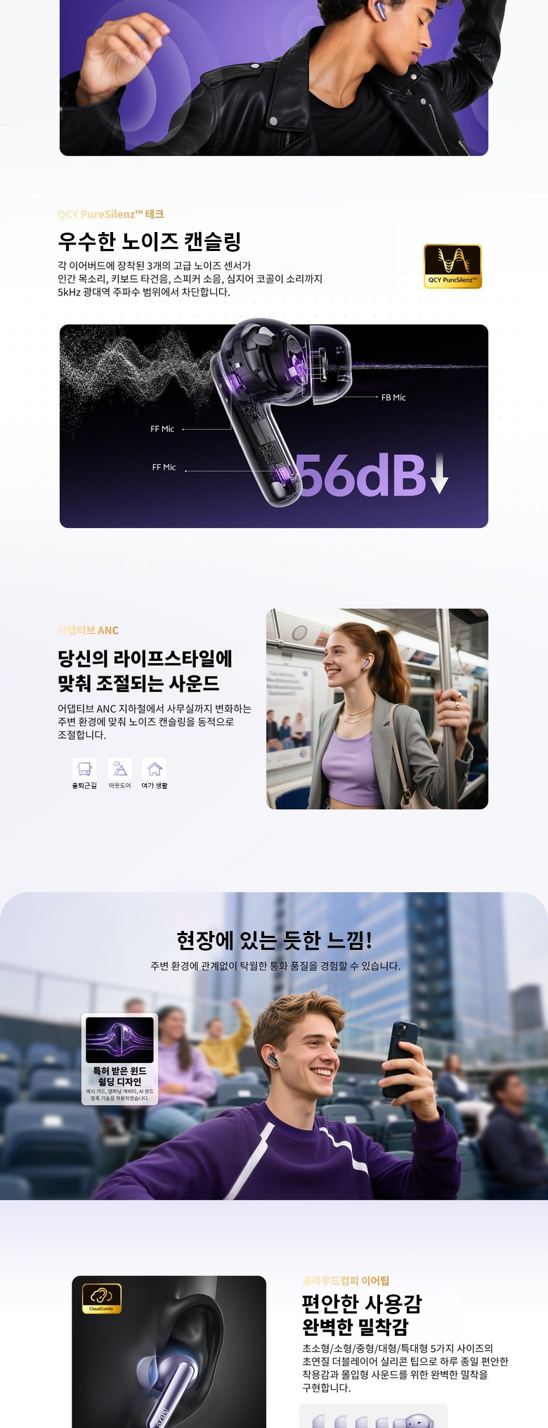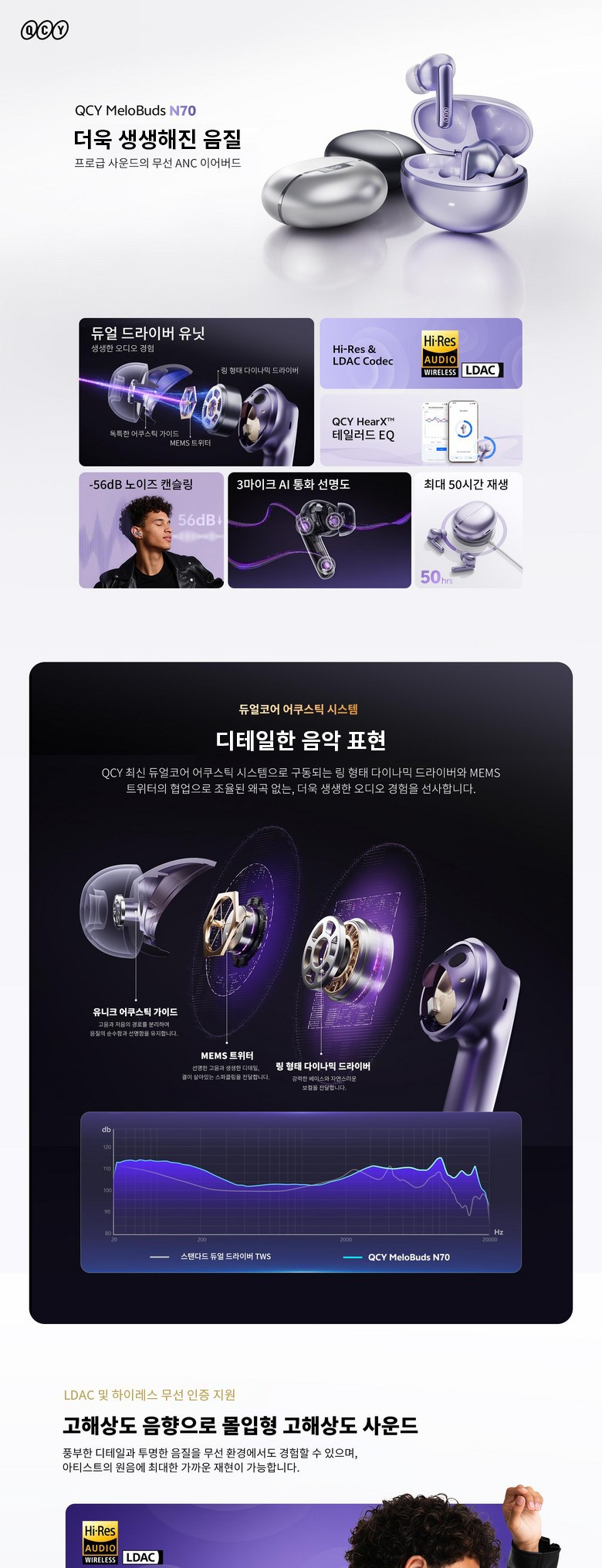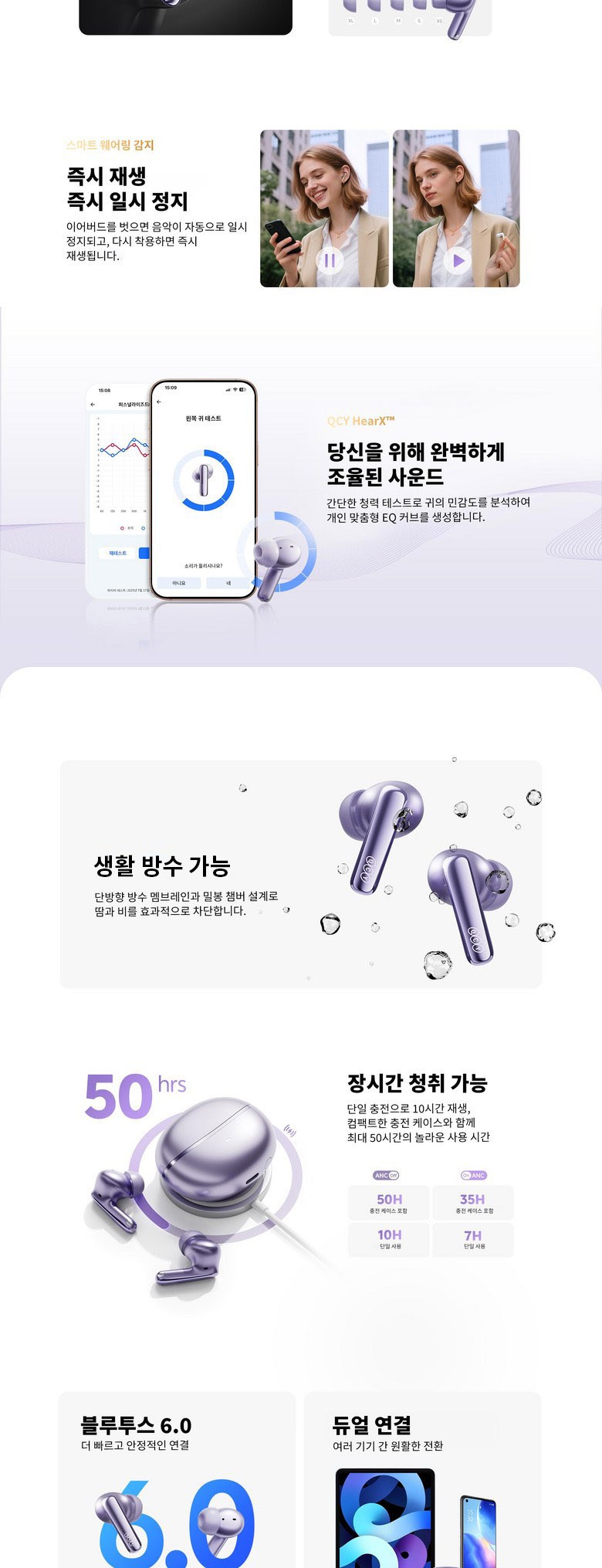 듀얼 드라이버 유닛이 생생한 오디오를 제공하고, 고해상도 및 LDAC 코덱으로 풍부한 음질을 구현하며, QCY HearX™ 맞춤형 이퀄라이저로 개인화된 사운드를 조절할 수 있고, 세 개의 마이크와 AI 기술로 선명한 통화 품질을 보장하며, 최대 50시간까지 재생이 가능합니다.