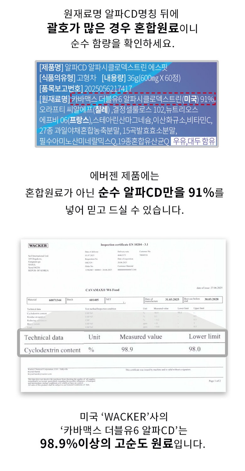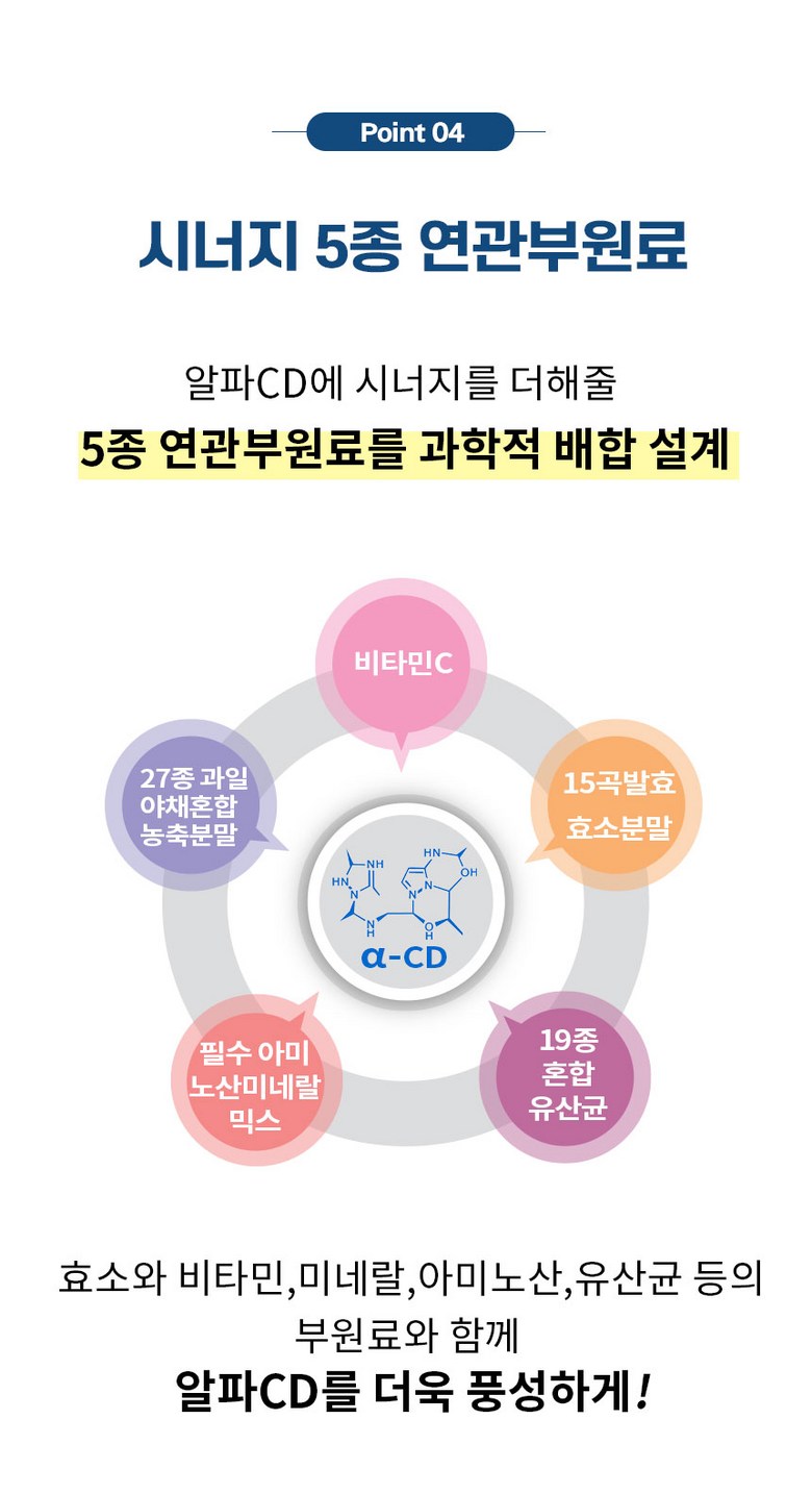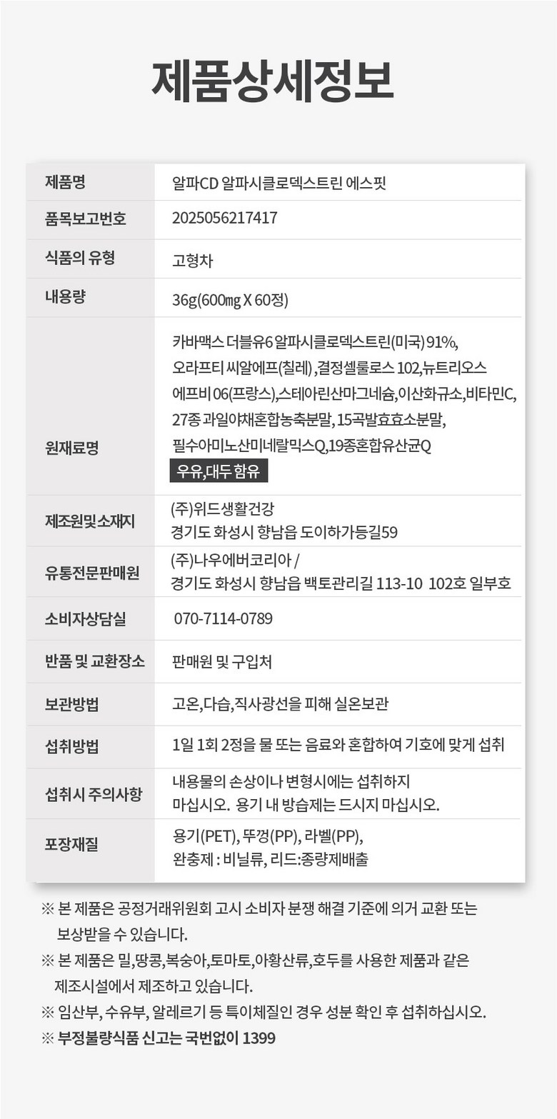 | 포장단위별 내용물의 용량(중량), 수량 | 36g(600mg X 60정) | 원재료명 및 함량 | 카바맥스 더블유6 알파시클로덱스트린(미국) 91%,오라프티 씨알에프(칠레) ,결정셀룰로스 102,뉴트리오스 에프비 06(프랑스),스테아린산마그네슘,이산화규소,비타민C,27종 과일야채혼합농축분말, 15곡발효효소분말,필수아미노산미네랄믹스Q,19종혼합유산균Q 우유,대두 함유 |