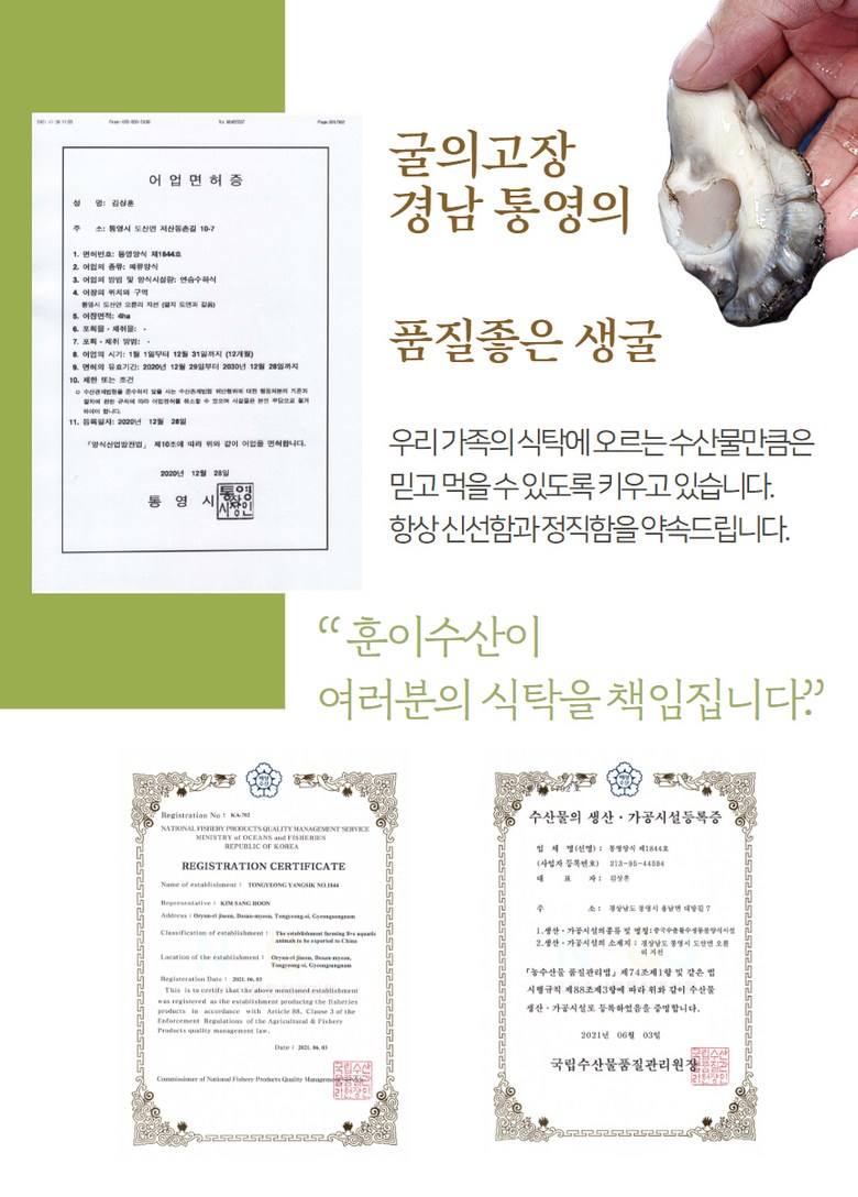 상호/대표자 | 훈이수산 / 김상훈 | 사업장 소재지 | 경상남도 통영시 용남면 대방길 7 훈이수산 |