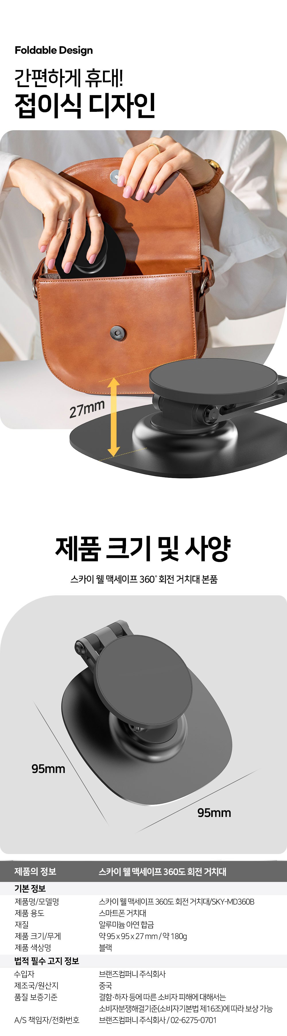 | 품명 및 모델명 | 스카이 웰 맥세이프 360도 회전 스마트폰 거치대 스탠드 SKY-MD360B 블랙 1개 | 인증/허가 사항 | 해당없음 |