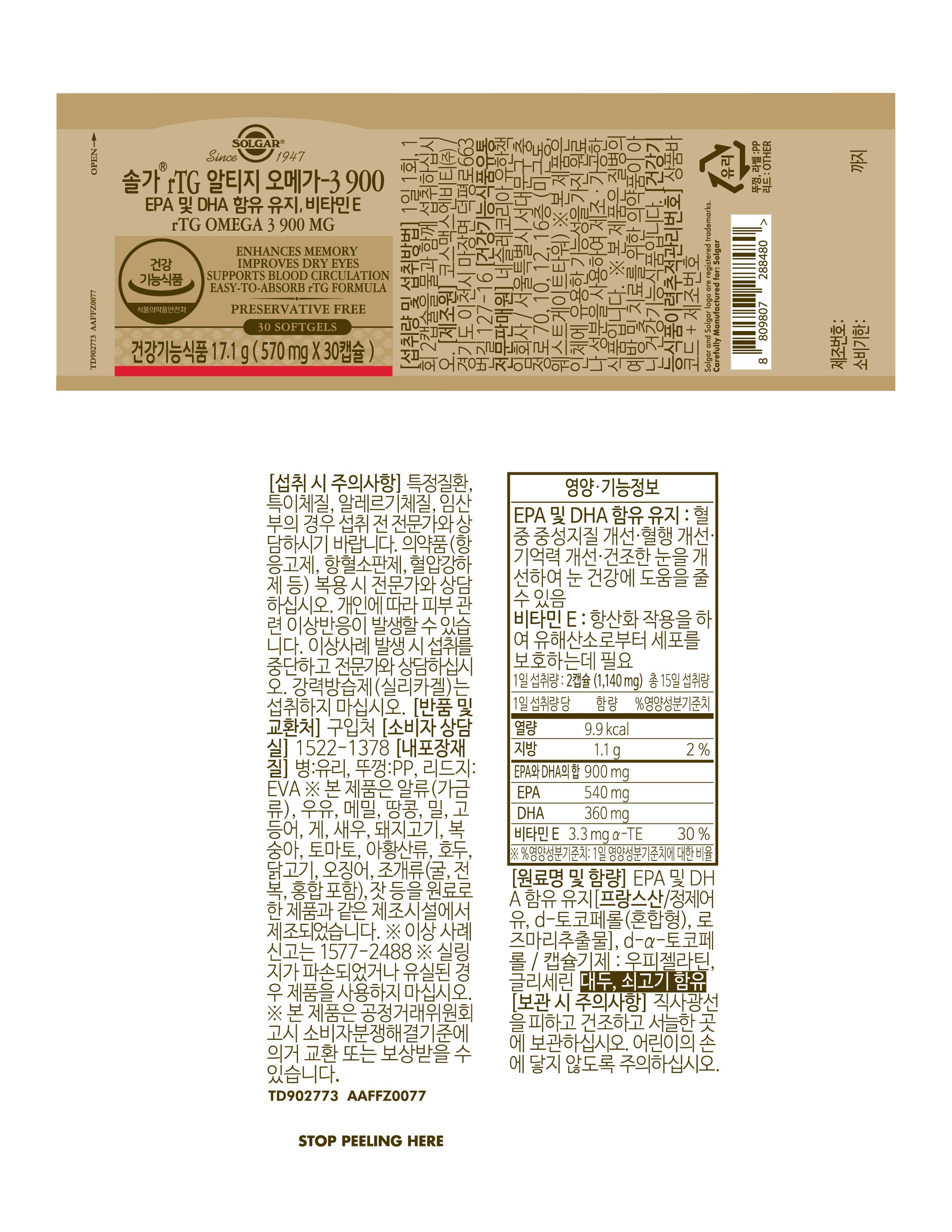 | 제품명 | 솔가 rTG 알티지 오메가-3 900 | 제조업소의 명칭과 소재지 | 컨텐츠 참조 |