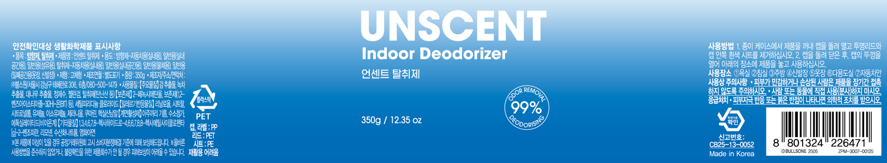| 품목 및 제품명 | 방향제, 탈취제 / 언센트 탈취제 | 용도(표백제의 경우 계열을 함께표시) 및 제형 | 방향제-자동차용(실내용), 일반용(실내 공간용), 일반용(섬유용), 탈취제-자동차용(실내용), 알반용(실내공간용), 일반용(물체용), 일반용(밀폐공간용(옷장, 신발장)) / 고체형 |