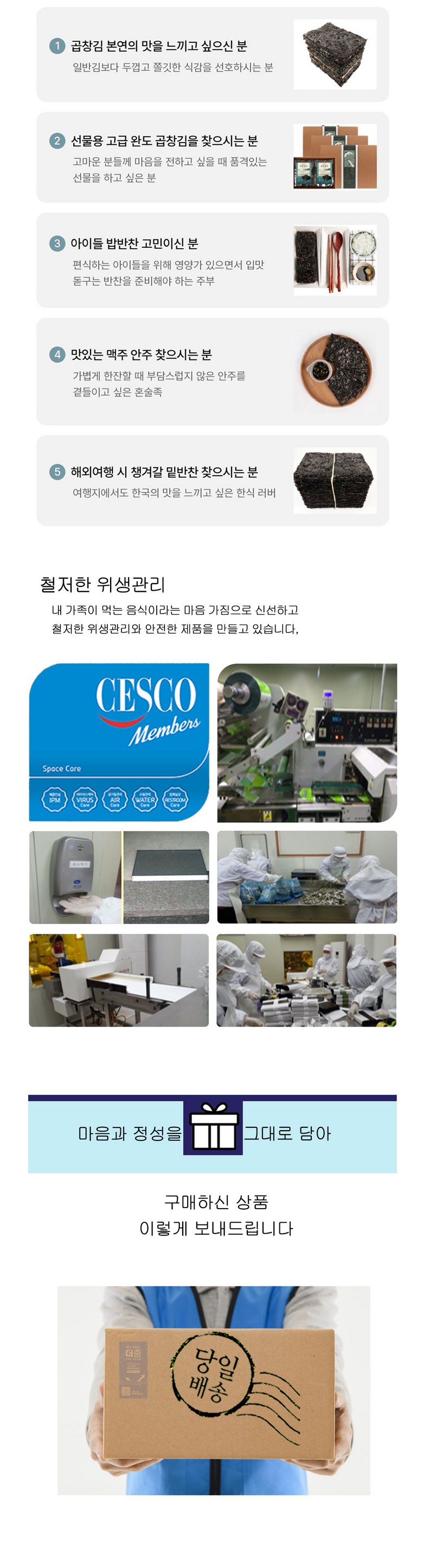 | 품목 또는 명칭 | 곱창김 | 포장단위별 내용물의 용량(중량),수량,크기 | 상품 상세페이지 참조 |