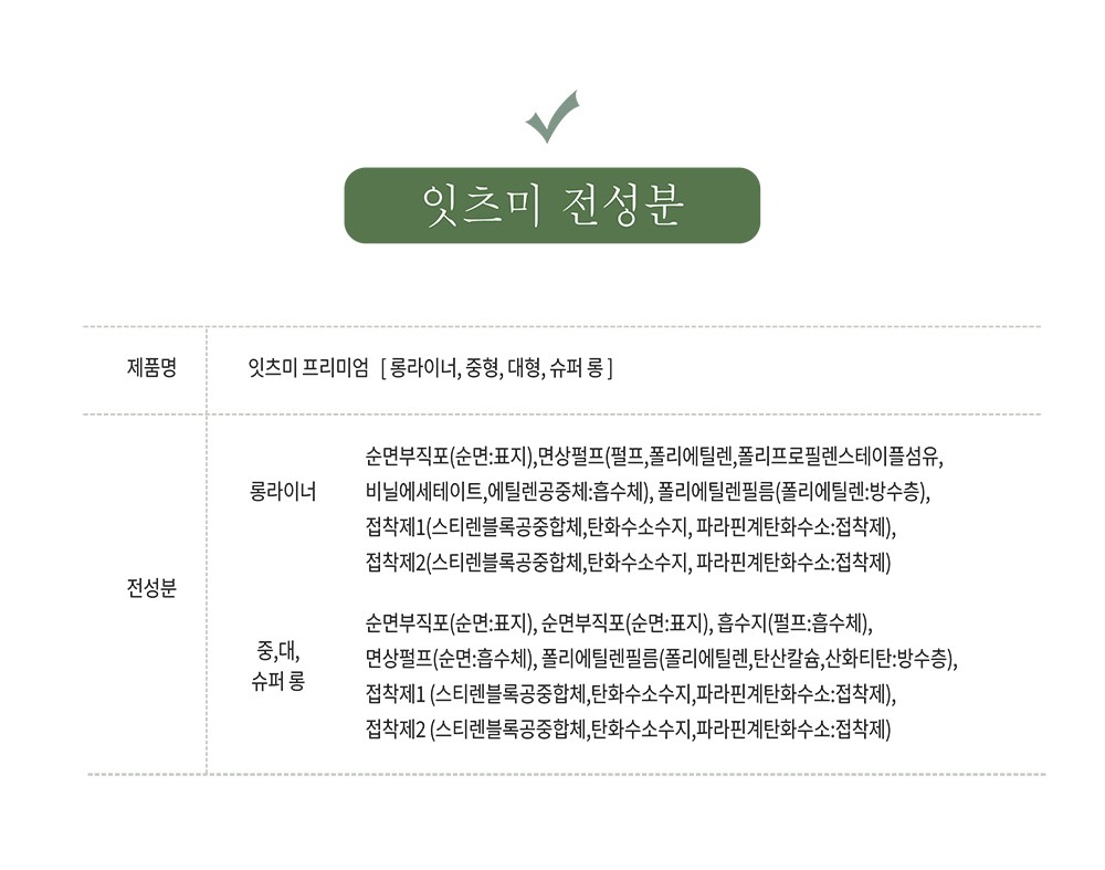 | 품명 및 모델명 | 잇츠미 프리미엄 롱라이너 | 인증/허가 사항 | 의약외품 |