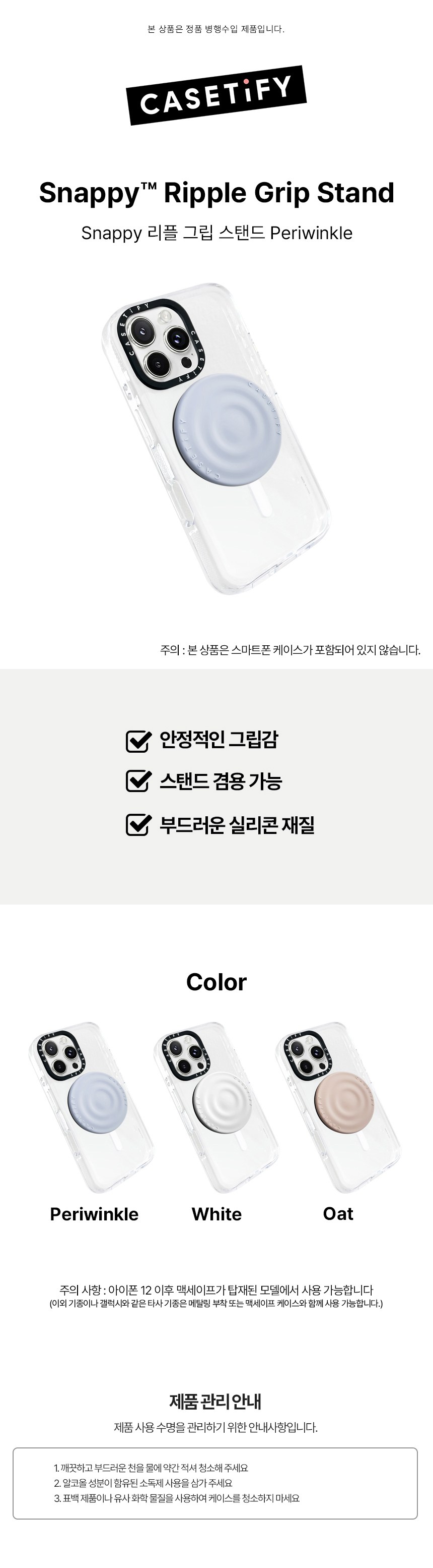 | 품명 및 모델명 | Casetify Snappy Ripple Grip Stand Periwinkle | 인증/허가 사항 | 해당없음(14세 이상) |