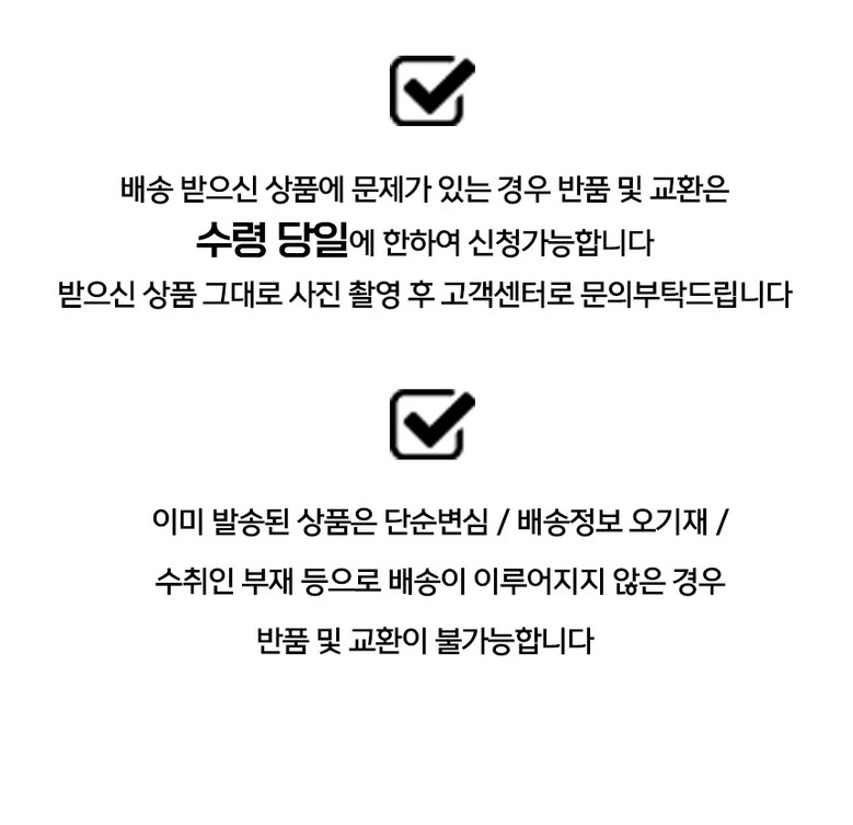 | 교환/반품 신청 기준일 | ㆍ단순변심에 의한 교환/반품은 제품 수령 후 7일 이내까지, 교환/반품 제한사항에 해당하지 않는 경우에만 가능 (배송비용과 교환/반품 비용 왕복배송비 고객부담) ㆍ상품의 내용이 표시·광고의 내용과 다른 경우에는 상품을 수령한 날부터 3개월 이내, 그 사실을 안 날 또는 알 수 있었던 날부터 |
