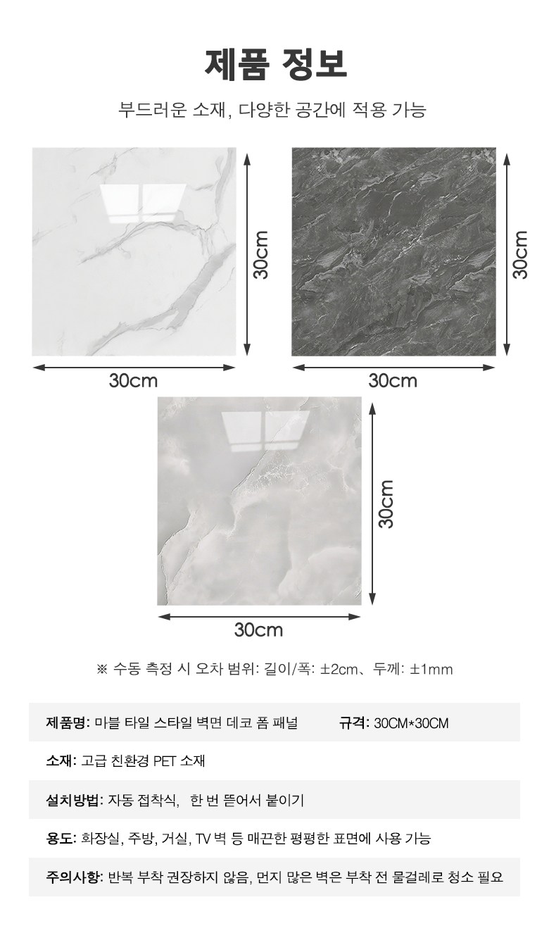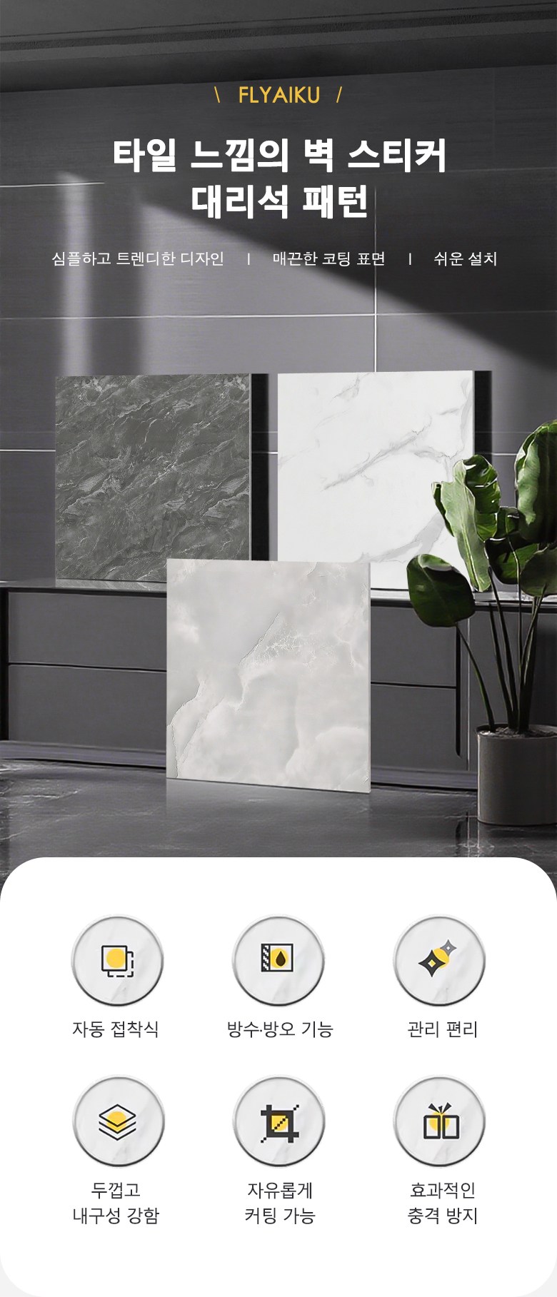 | 품명 및 모델명 | Flyaiku 접착식 데코타일 인조 대리석 벽 시트지 | 인증/허가 사항 | 법에 의한 인증·허가 등을 받았음을 확인할 수 있는 경우 그에 대한 사항 |