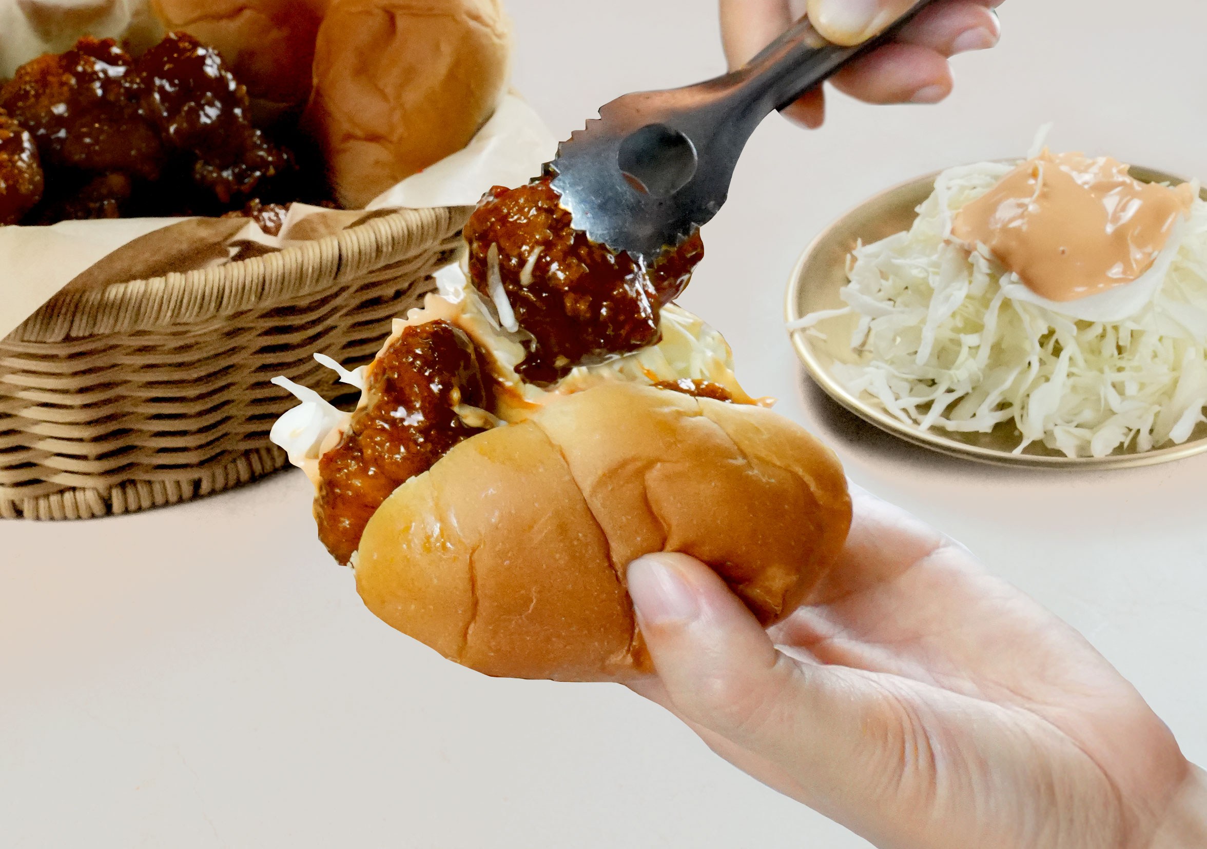 재료: 모닝빵 3개, 치킨강정 6개, 양배추 100g, 피클 약간, 케첩 약간, 마요네즈 약간