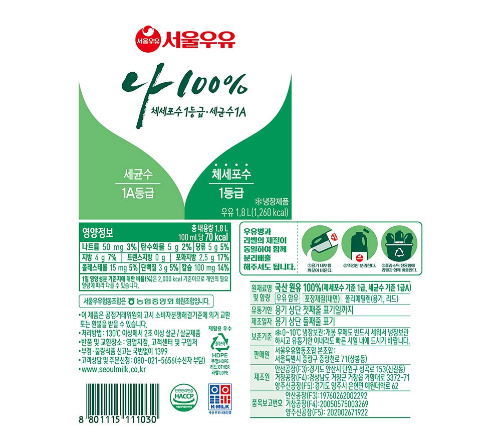 | 제품명 | 서울우유 나 100% | 식품의 유형 | 컨텐츠 참조 |
