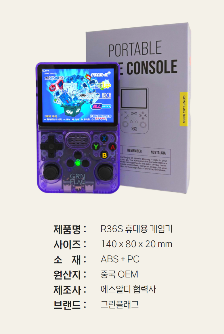 | 품명 및 모델명 | 그린플래그 R36S 휴대용 게임기 | 인증/허가 사항 | 상품 상세페이지 참조 |