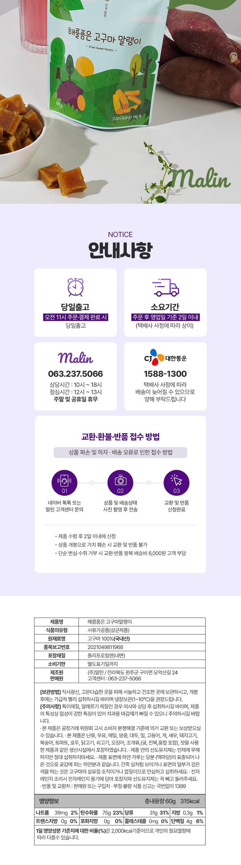 | 품목 또는 명칭 | 고구마말랭이 | 포장단위별 내용물의 용량(중량),수량,크기 | 60g |