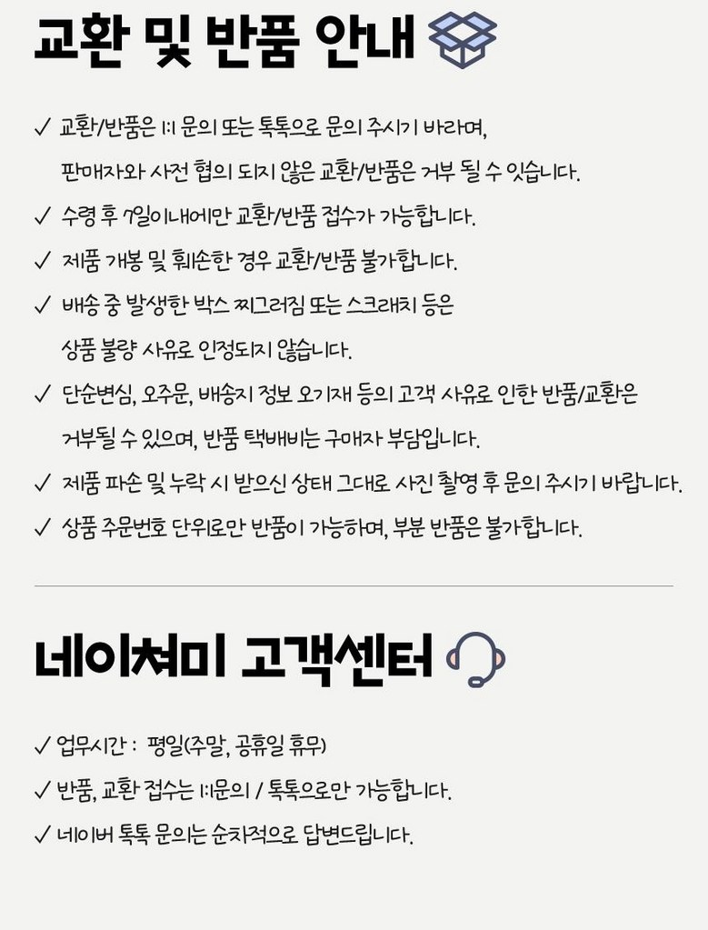 - ㆍ모니터 해상도의 차이로 인해 색상이나 이미지가 실제와 달라, 고객이 단순 변심으로 교환/반품을 무료로 요청하는 경우