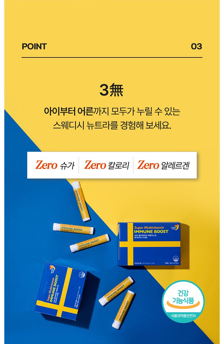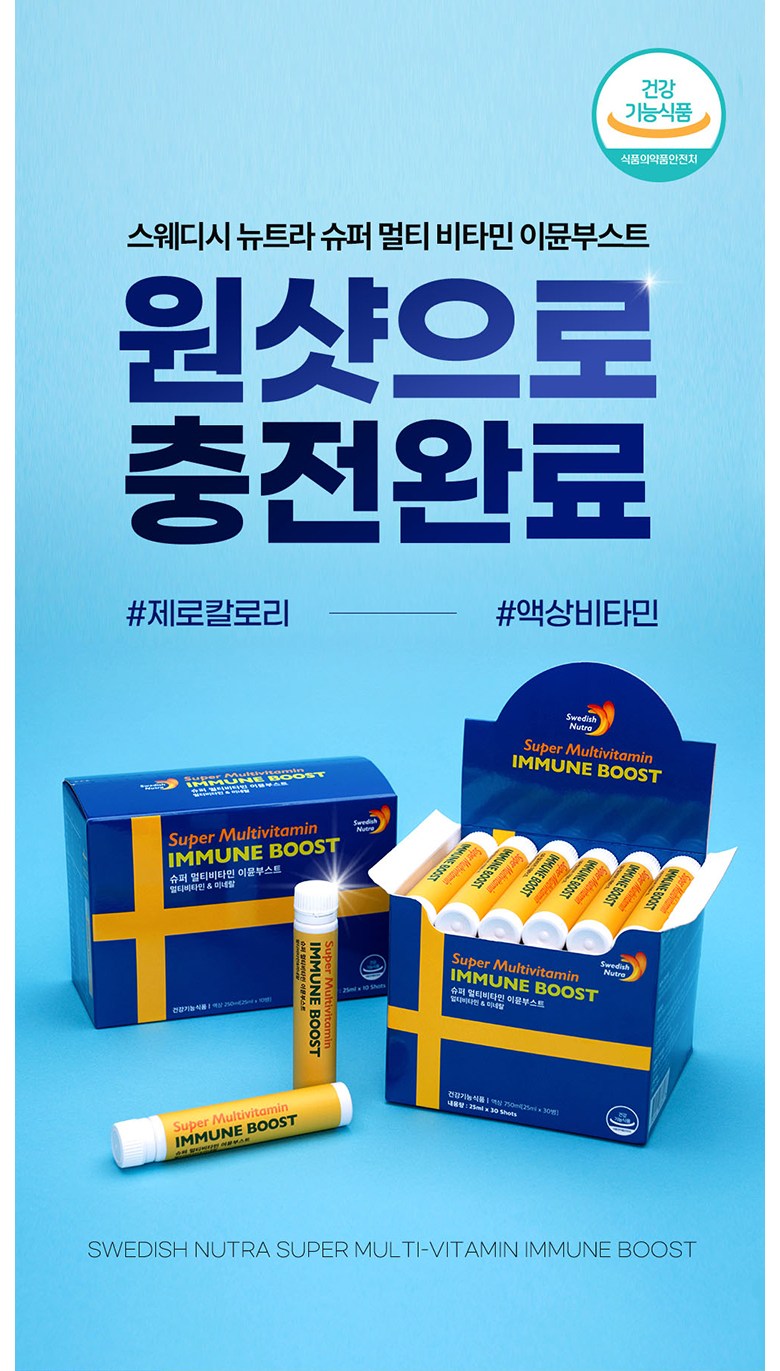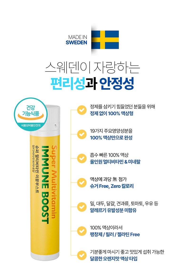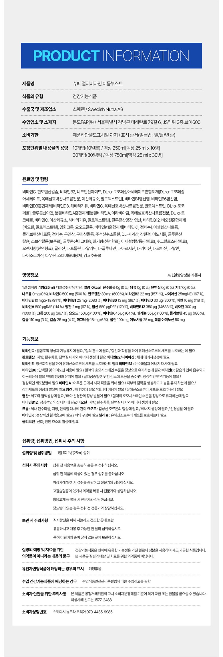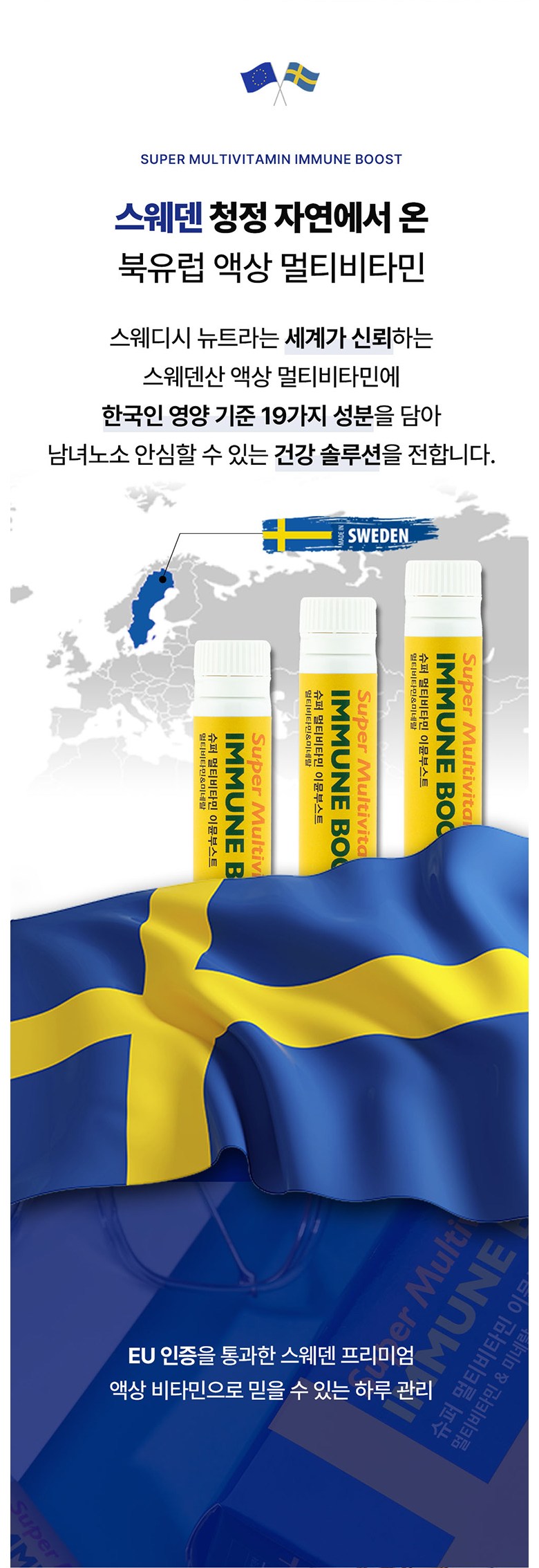 | 제품명 | 슈퍼 멀티비타민 이뮨부스트 | 제조업소의 명칭과 소재지 | Swedish Nutra AB / Made in SWEDEN |