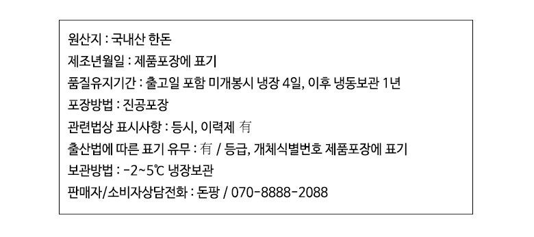 | 배송방법 | 신선/냉장/냉동 | 배송비 | 무료배송 - 도서산간 지역 배송불가 |