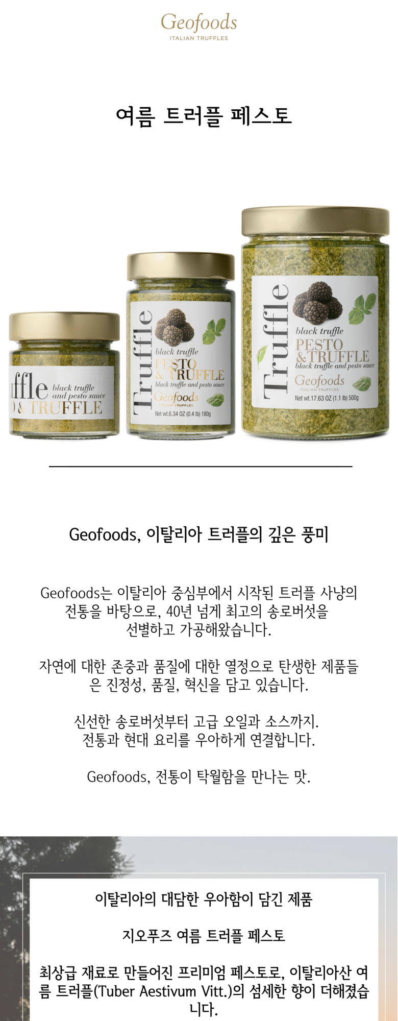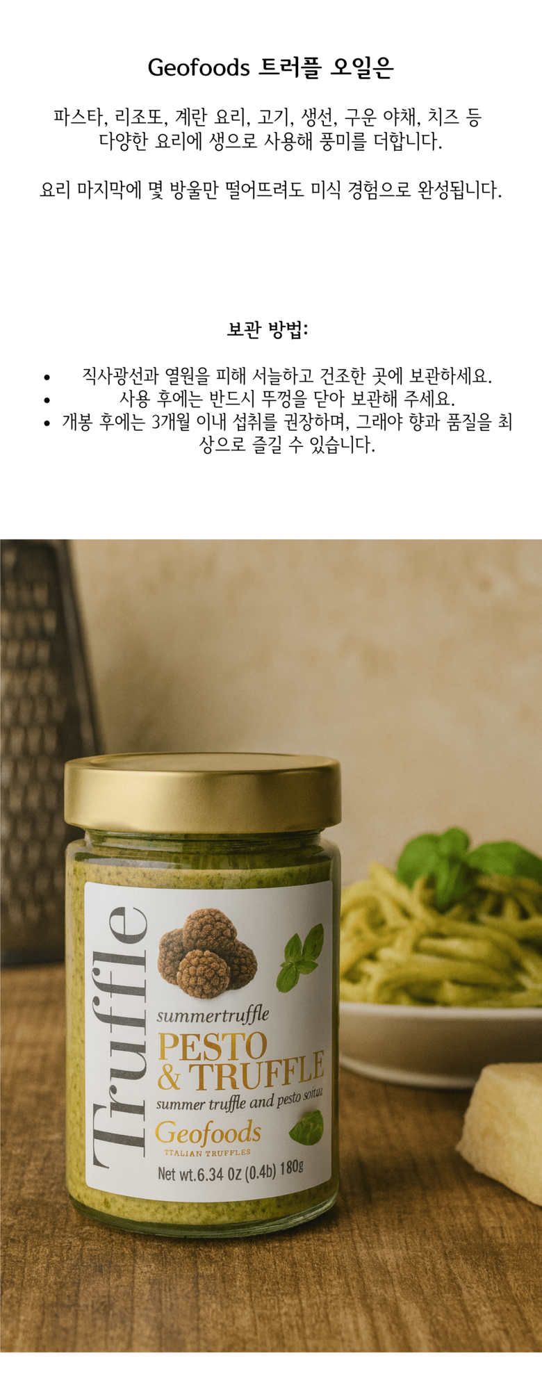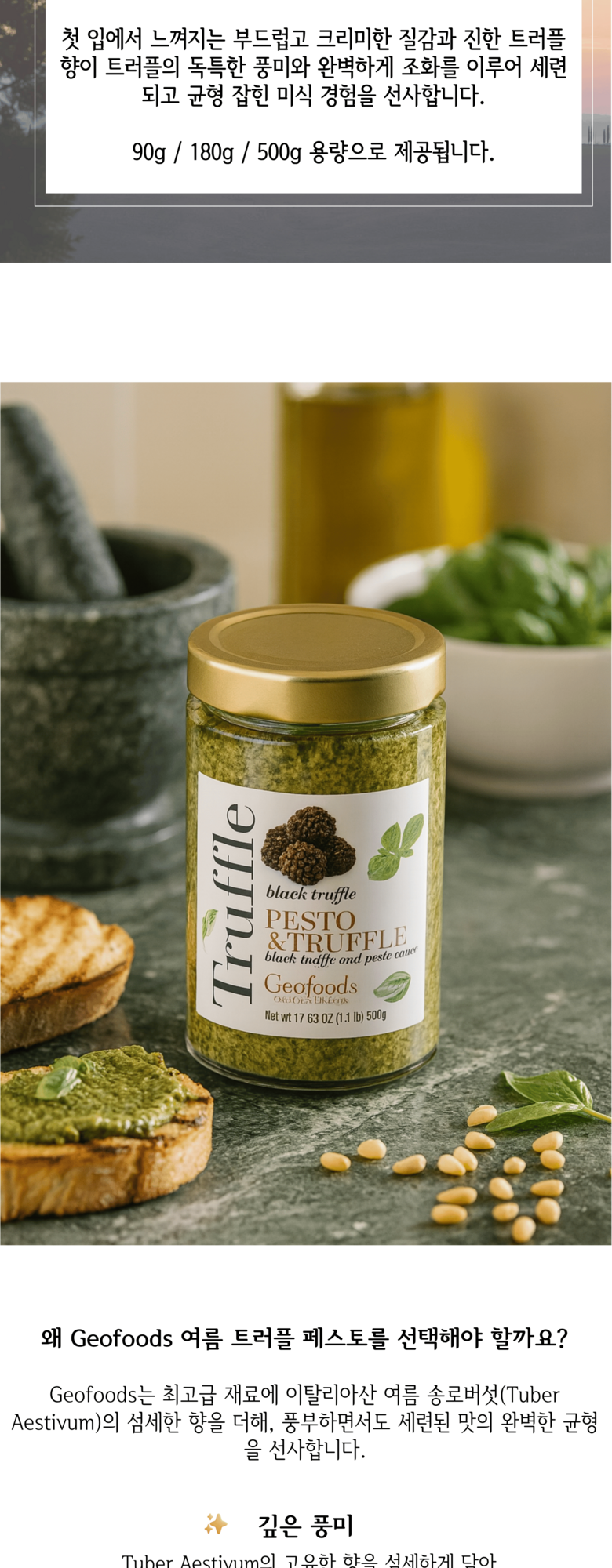 향긋한 신선 바질, 엑스트라 버진 올리브 오일, 그리고 엄선된 트러플로 만들어져 파스타, 전채요리, 메인 요리에 미식적인 감각을 더합니다.