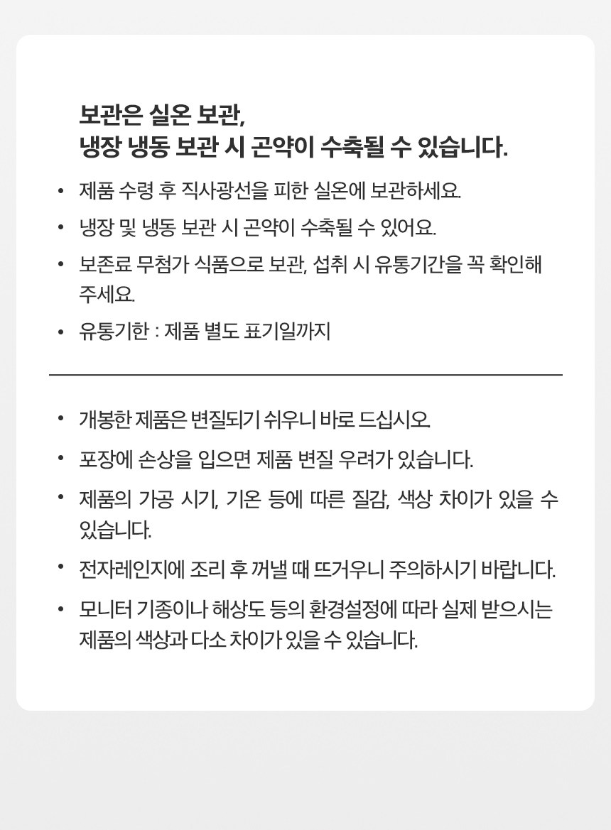 - ㆍ모니터 해상도의 차이로 인해 색상이나 이미지가 실제와 달라, 고객이 단순 변심으로 교환/반품을 무료로 요청하는 경우