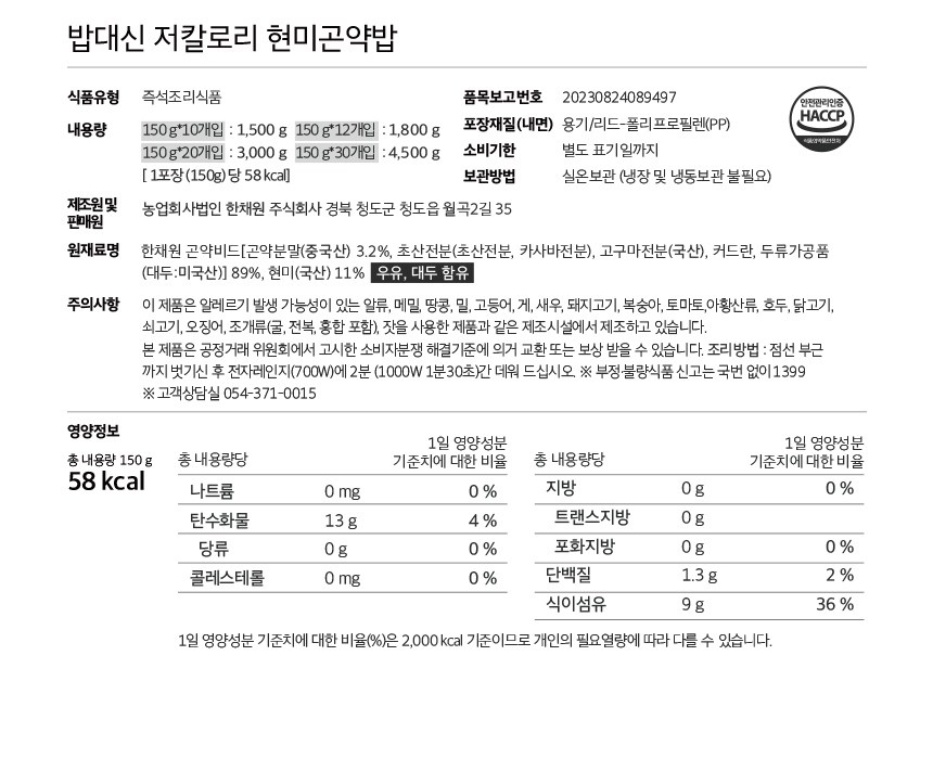 | 제품명 | 밥대신 저칼로리 현미곤약밥 | 식품의 유형 | 컨텐츠 참조 |