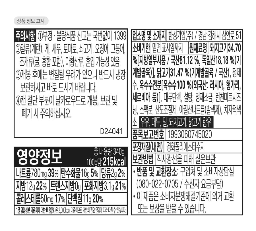 | 포장단위별 내용물의 용량(중량), 수량 | 340g, 6개 | 원재료명 및 함량 | 컨텐츠 참조 |