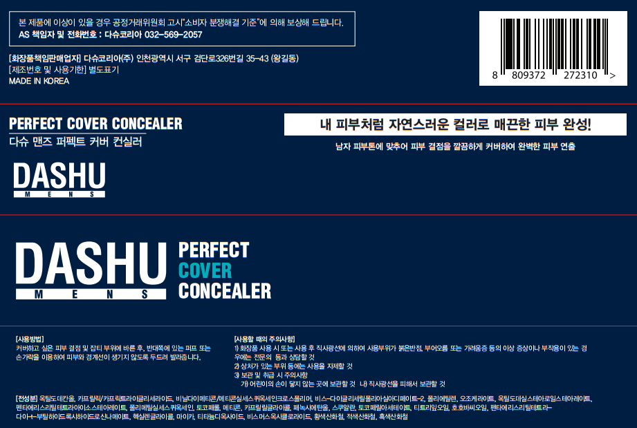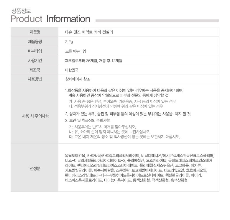 | 화장품제조업자, 화장품책임판매업자 및 맞춤형화장품판매업자 | 화성코스메틱(주) / 다슈코리아 | 제조국 | 대한민국 |