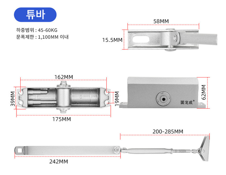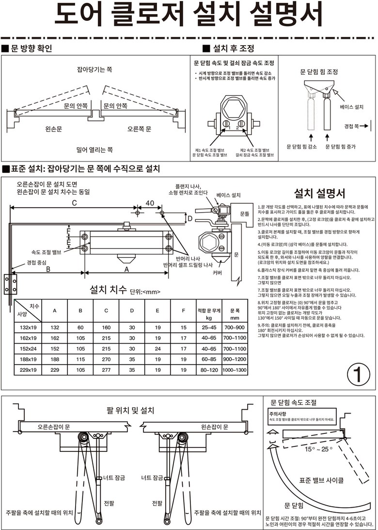 ·추천 설치 거리: 도어 클로저는 도어 상부에서 15-20cm 이내에 도어 프레임 상부에 설치되어야 하며 암 빔이 너무 길지 않도록 가능한 한 힌지 쪽에 가까워야 합니다.