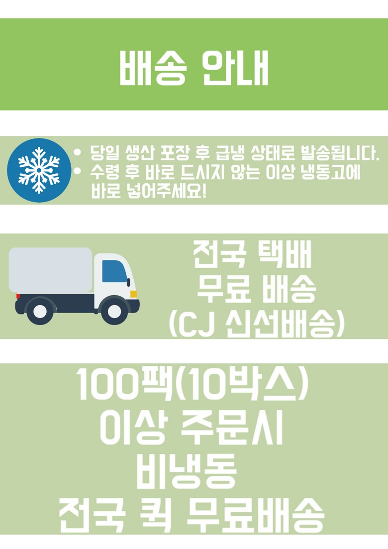 | 배송방법 | 신선/냉장/냉동 | 배송비 | 무료배송 - 도서산간 지역 배송불가 |