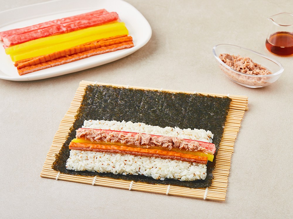 김, 게맛살, 단무지, 햄, 참치 동봉