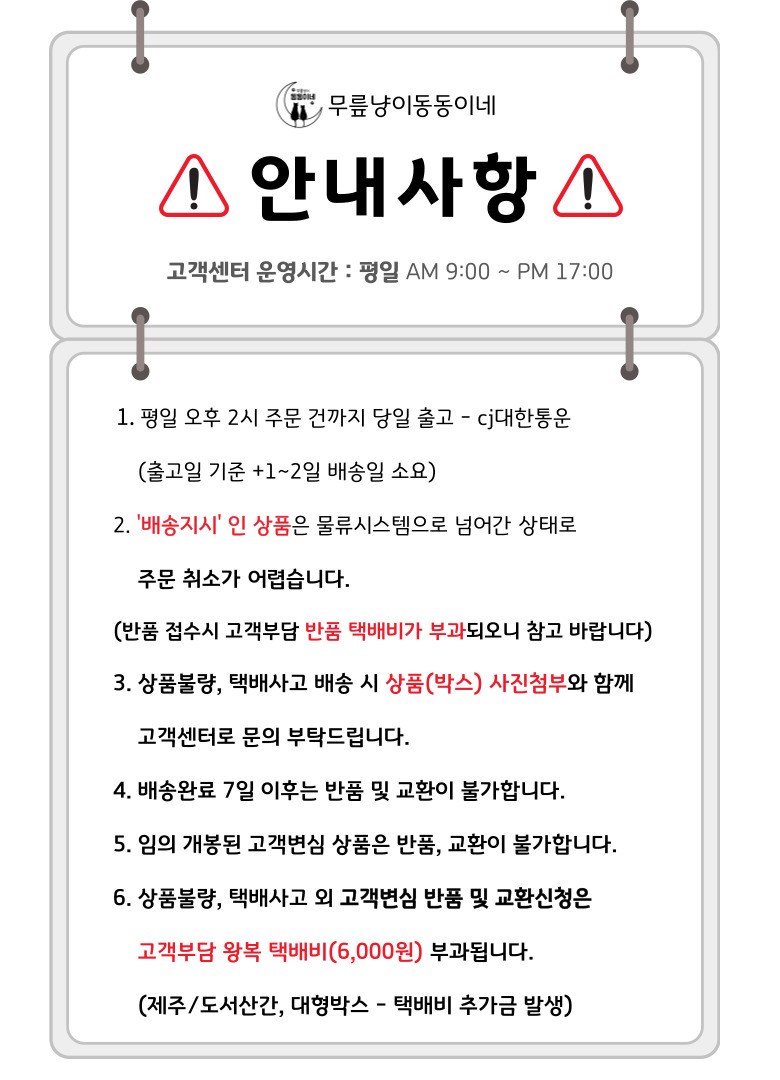 | 교환/반품 비용 (왕복비용) | 6,000원 - 단, 고객 변심의 경우에만 발생 - 도서산간 및 일부 지역 추가비용 발생 |