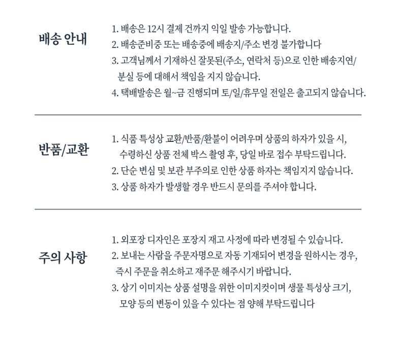 | 배송방법 | 신선/냉장/냉동 | 배송비 | 무료배송 - 도서산간 지역 배송불가 |