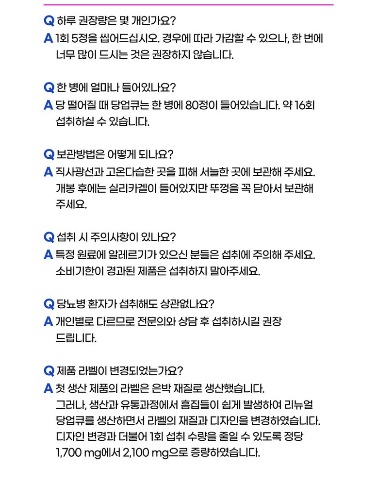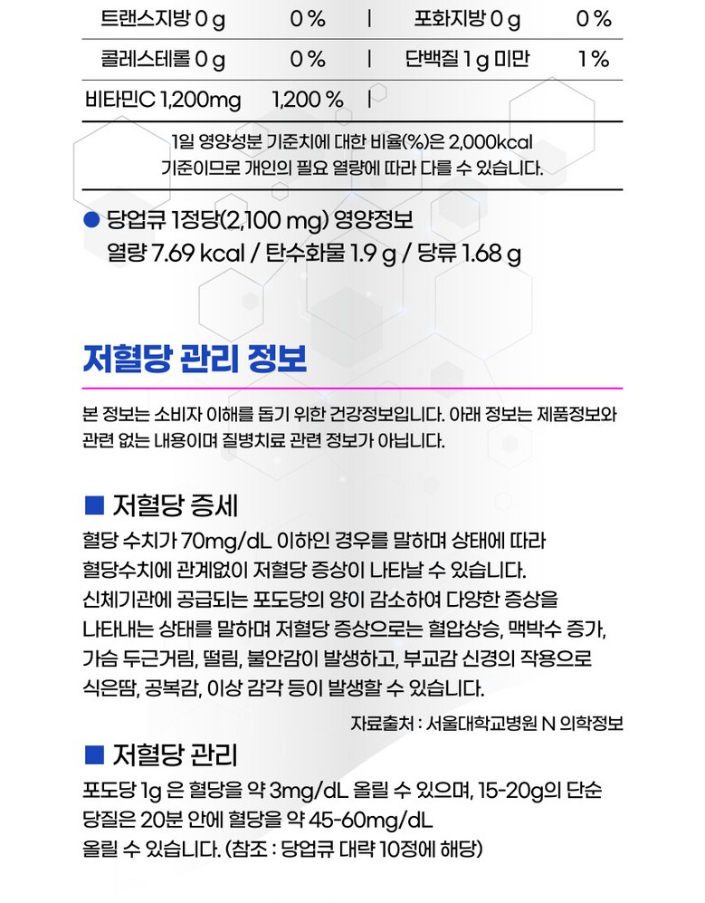 | 포장단위별 내용물의 용량(중량), 수량 | 1병 2100mg X 80정(168g) | 원재료명 및 함량 | 포도당 75.9%, 함수포도당 20%, 레몬향분말(합성향료), 스테아린산마그네슘, 무수구연산, 비타민C 0.8%, 이산화규소, 우유, 대두 함유 |
