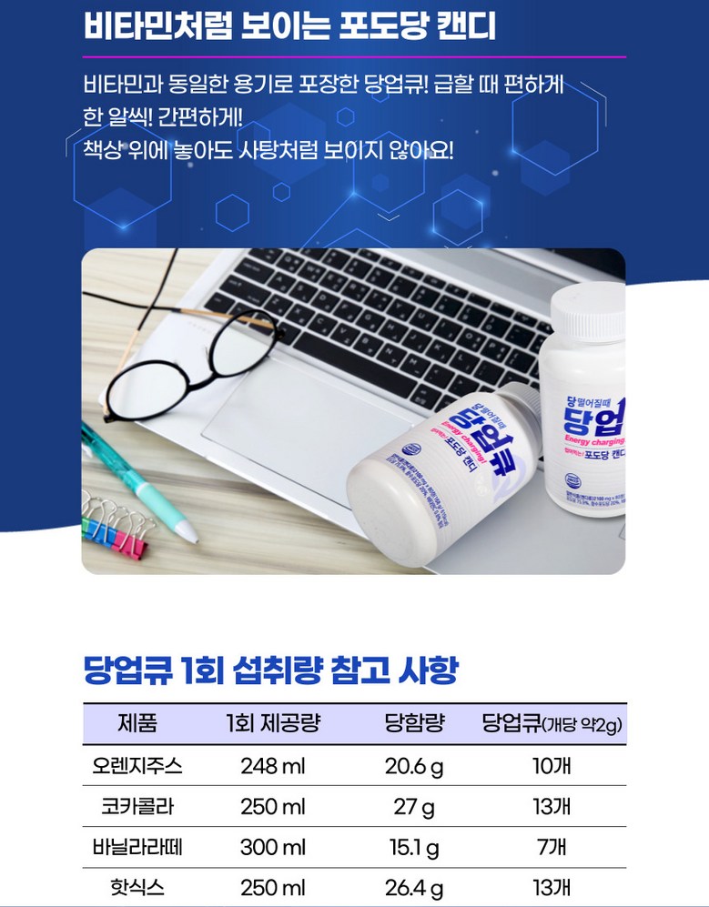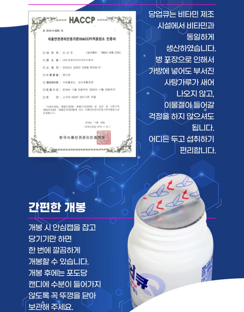 | 제품명 | 당떨어질때 당업큐 씹어먹는 포도당 캔디 | 식품의 유형 | 일반식품(캔디류) |