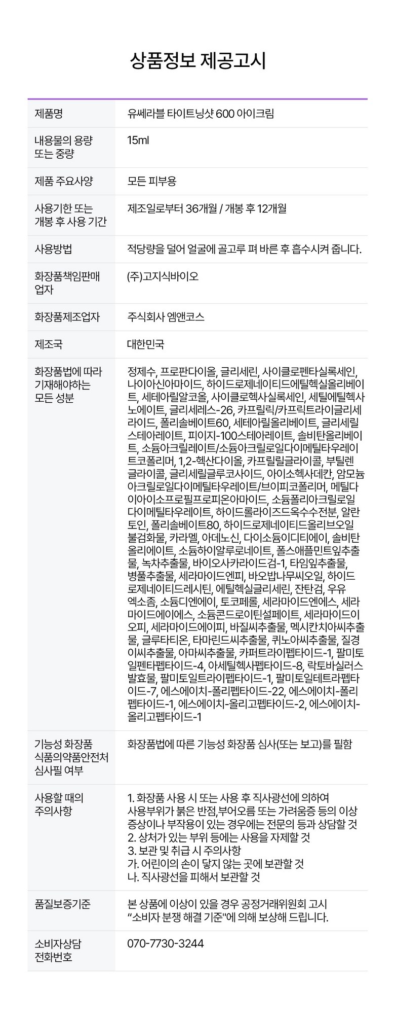 | 화장품제조업자, 화장품책임판매업자 및 맞춤형화장품판매업자 | 상품 상세페이지 참조 | 제조국 | 상품 상세페이지 참조 |