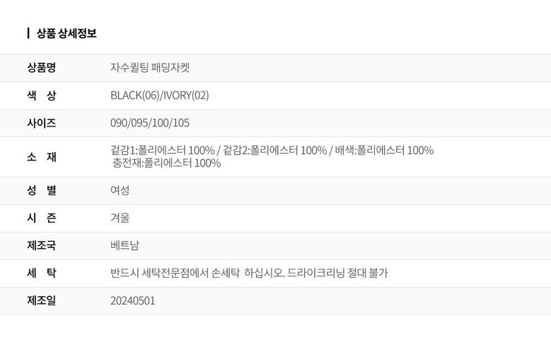 | 제조국 | 상품 상세페이지 참조 | 세탁방법 및 취급시 주의사항 | 상품 상세페이지 참조 |