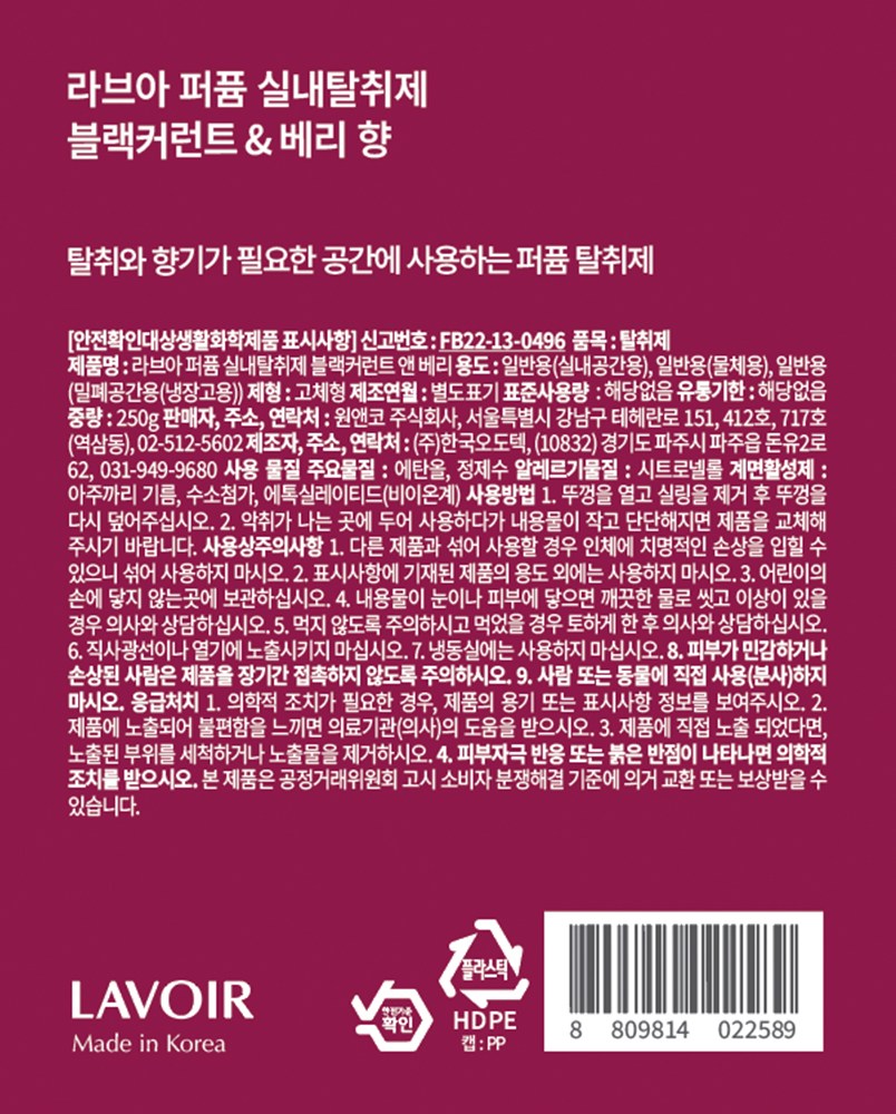 | 품목 및 제품명 | 탈취제 / 라브아 퍼퓸 실내탈취제 블랙커런트 앤 베리 | 용도(표백제의 경우 계열을 함께표시) 및 제형 | 일반용 (물체용), 일반용 (밀폐공간용 (냉장고용)), 일반용 (실내공간용) / 고체형 |